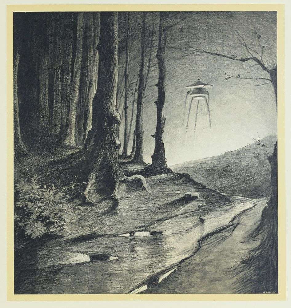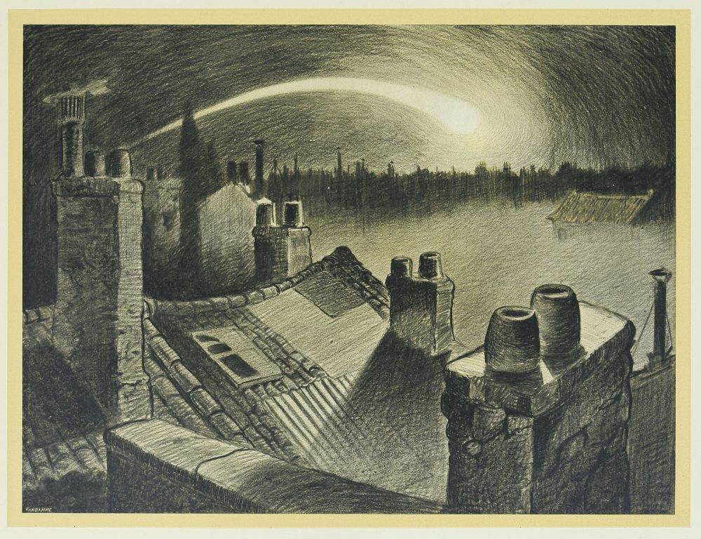 A cette heure-là, j’étais chez moi, écrivant, assis devant mon bureau, et bien que mes fenêtres s’ouvrissent sur Ottershaw et que les jalousies aient été levées—car j’aimais à cette époque regarder le ciel nocturne—je ne vis rien du phénomène. Cependant, la plus étrange de toutes les choses, qui des espaces infinis vinrent sur la terre, dut tomber pendant que j’étais assis là, visible si j’avais seulement levé les yeux au moment où elle passait. Quelques-uns de ceux qui la virent dans son vol rapide rapportèrent qu’elle produisait une sorte de sifflement. Pour moi, je n’en entendis rien. Un grand nombre de gens dans le Berkshire, le Surrey et le Middlesex durent apercevoir son passage et tout au plus pensèrent à quelque météore. Personne ne paraît s’être préoccupé de rechercher, cette nuit-là, la masse tombée.