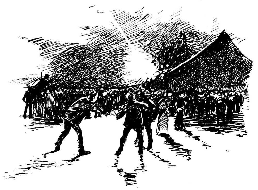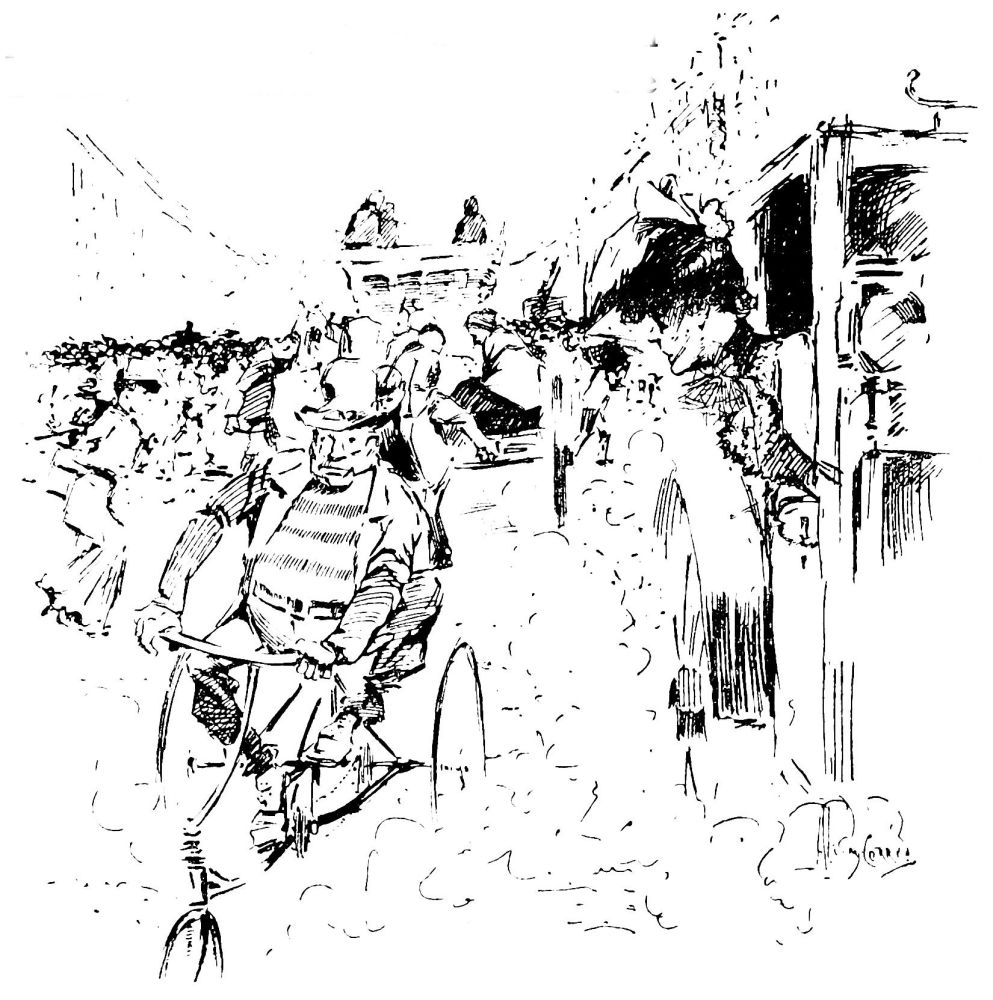 Il y avait sur la route, près des carrières de sable, une demi-douzaine au moins de voitures de louage de la station de Woking, un cabriolet venu de Chobham et un landau majestueux. Non loin, se trouvaient d’innombrables bicyclettes. De plus, un grand nombre de gens, en dépit de la chaleur, étaient venus à pied de Woking et de Chertsey, de sorte qu’il y avait là maintenant une foule considérable, dans laquelle se voyaient plusieurs jolies dames en robes claires.