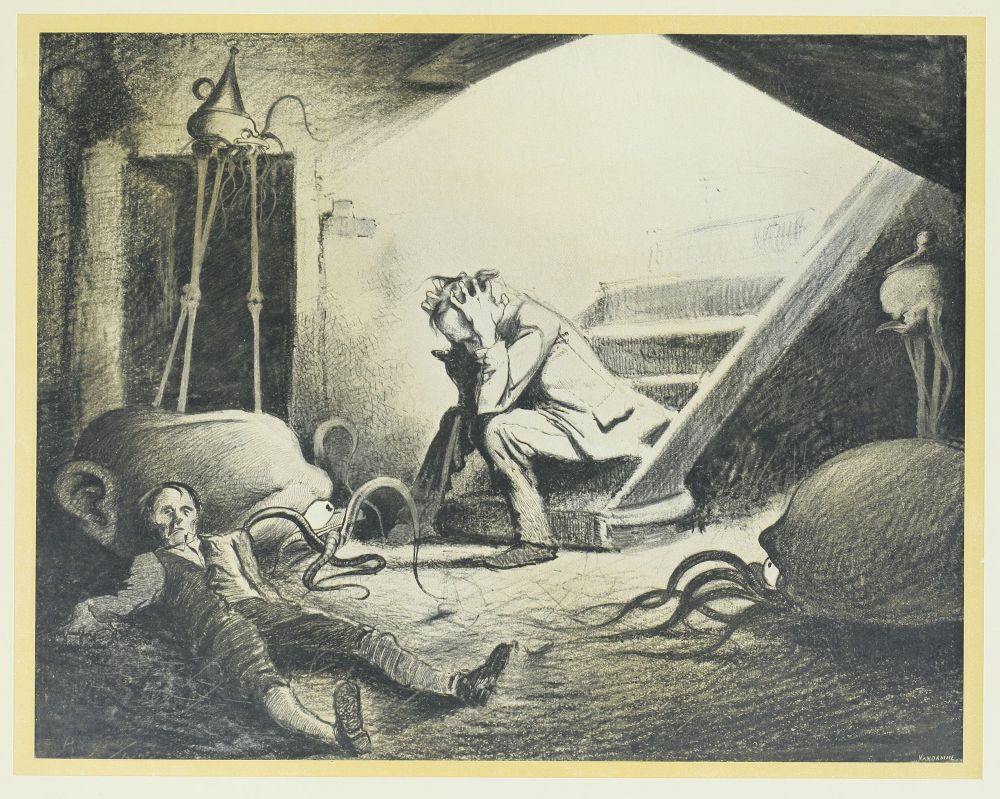 Il me faut avouer que la détresse et les dangers de ces moments ont laissé, dans mon esprit, une constante impression de doute et d’insécurité. J’écris, dans mon bureau, à la clarté de la lampe, et soudain, je revois la vallée, qui s’étend sous mes fenêtres, incendiée et dévastée; je sens la maison autour de moi vide et désolée. Je me promène sur la route de Byfleet, et je croise toutes sortes de véhicules, une voiture de boucher, un landau de gens en visite, un ouvrier à bicyclette, des enfants s’en allant à l’école, et soudain, tout cela devient vague et irréel, et je crois encore fuir avec l’artilleur, à travers le silence menaçant et l’air brûlant. La nuit, je revois la Poussière Noire obscurcissant les rues silencieuses, et, sous ce linceul, des cadavres grimaçants; ils se dressent devant moi, en haillons et à demi dévorés par les chiens; ils m’invectivent et deviennent peu à peu furieux, plus pâles et plus affreux, et se transforment enfin en affolantes contorsions d’humanité. Puis je m’éveille, glacé et bouleversé, dans les ténèbres de la nuit.