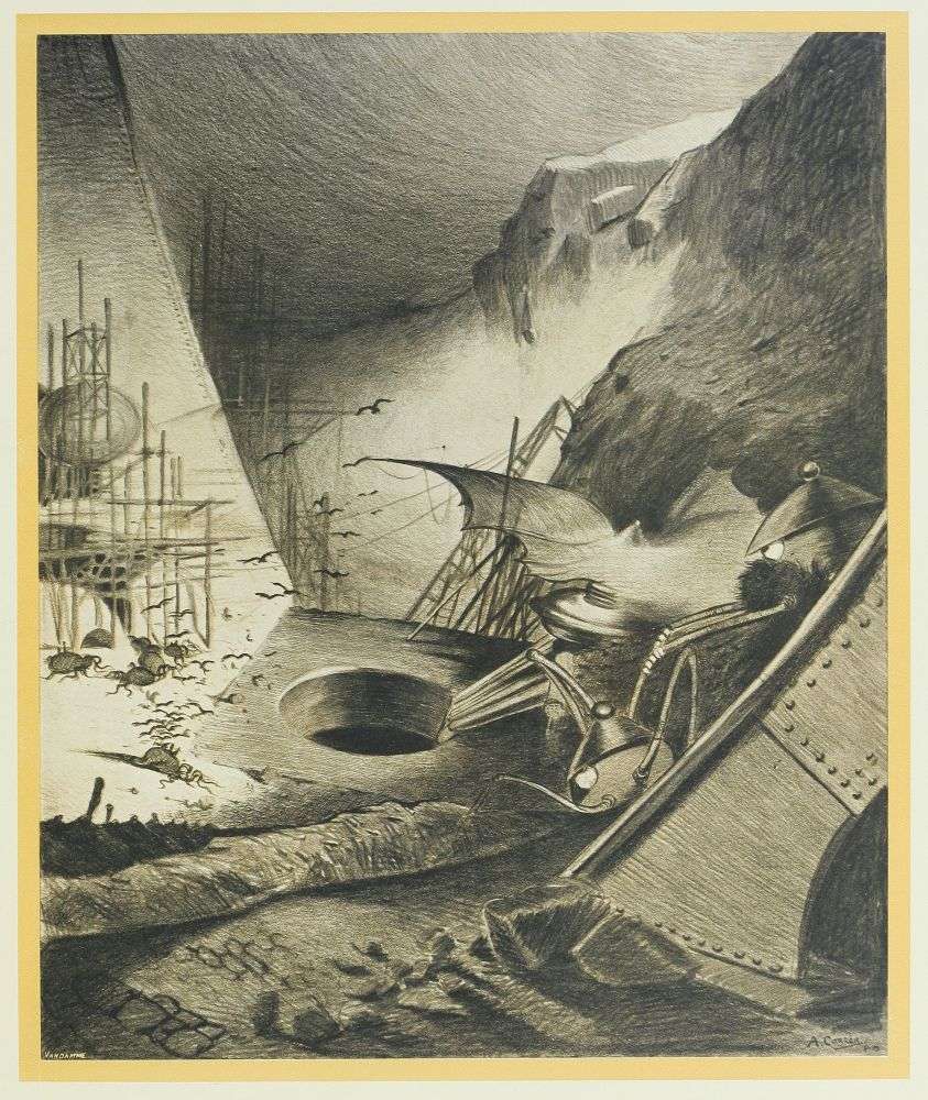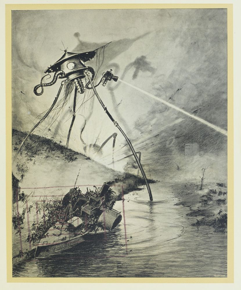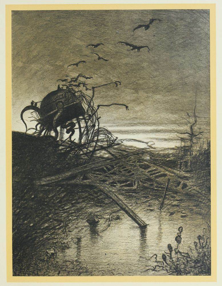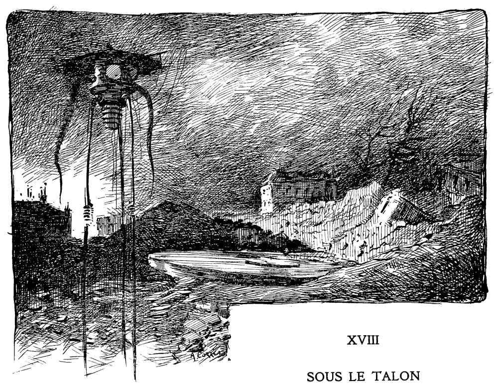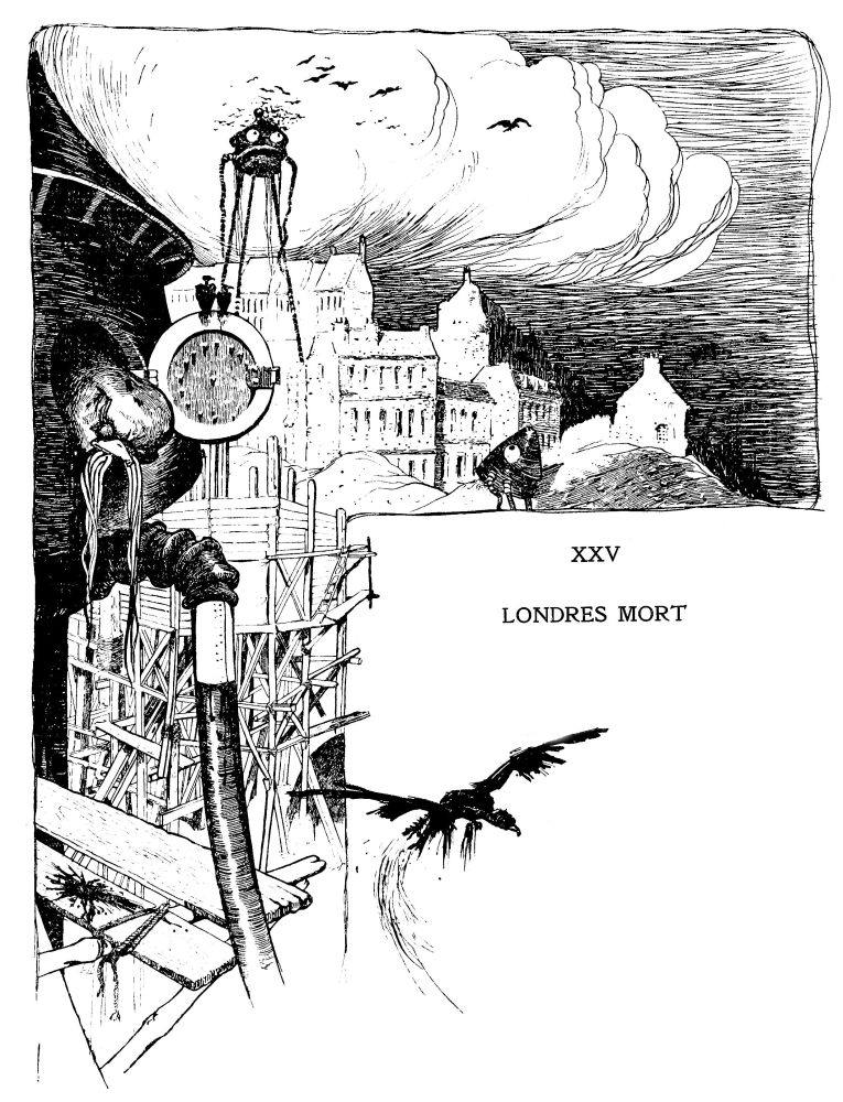 Je restais là debout, contemplant le gouffre. Soudain le soleil levant enflamma le monde de ses rayons étincelants, et mon cœur bondit de joie. La fosse était encore obscure; les formidables engins, d’une puissance et d’une complexité si grandes et si surprenantes, si peu terrestres par leurs formes tortueuses et bizarres, montaient, sinistres, étranges et vagues, hors des ténèbres, vers la lumière. J’entendais une multitude de chiens qui se battaient autour des cadavres, gisant dans l’ombre, au fond de la cavité. Sur l’autre bord, plate, vaste et insolite, était la grande machine volante qu’ils expérimentaient dans notre atmosphère plus dense, quand la maladie et la mort les avaient arrêtés. Et cette mort ne venait pas trop tôt. Un croassement me fit lever la tête, et mes regards rencontrèrent l’immense machine de guerre, qui ne combattrait plus jamais, et les lambeaux de chair rougeâtre qui pendaient des sièges des machines renversées, sur le sommet de Primrose Hill.