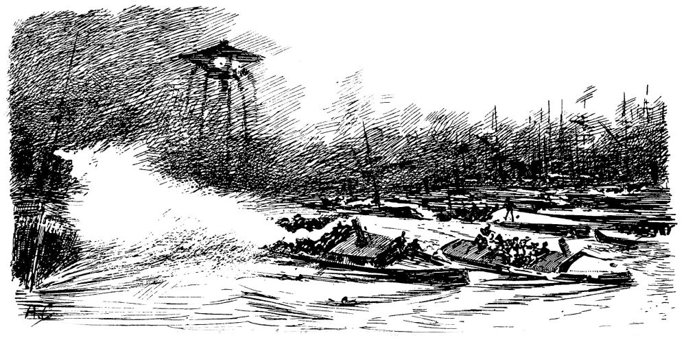 Je trouvai une vingtaine de personnes environ rassemblées autour du trou immense dans lequel s’était enfoncé le cylindre. J’ai déjà décrit l’aspect de cette masse colossale enfouie dans le sol. Le gazon et le sable alentour semblaient avoir été bouleversés par une soudaine explosion. Nul doute que sa chute n’ait produit une grande flamme subite. Henderson et Ogilvy n’étaient pas là. Je crois qu’ils s’étaient rendu compte qu’il n’y avait rien à faire pour le présent et qu’ils étaient partis déjeuner.