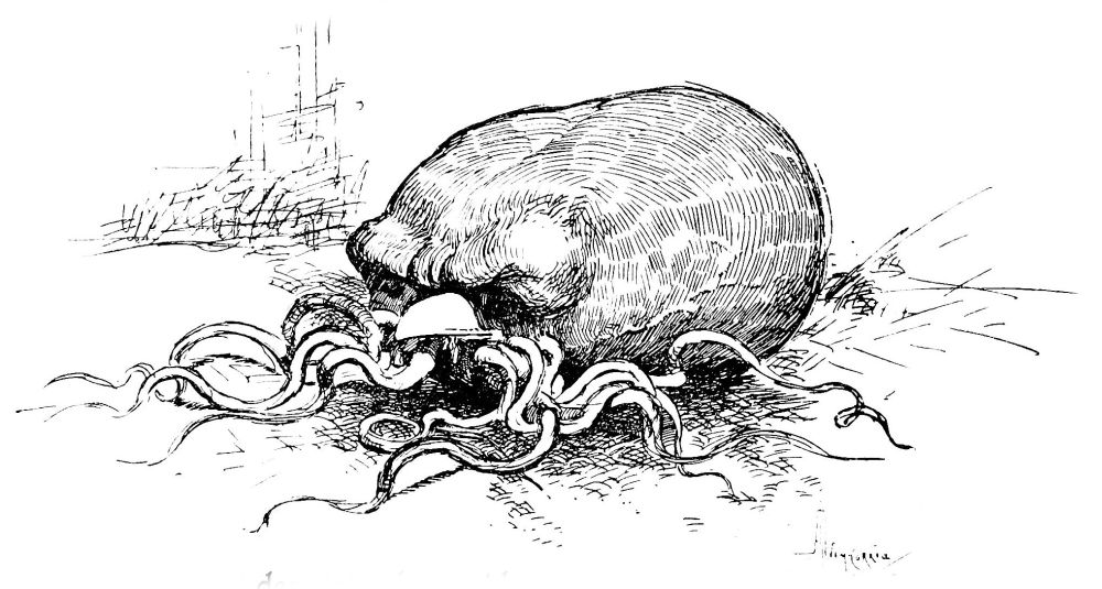 J’ai déjà donné les résultats de l’examen anatomique des Marsiens, autant qu’un tel examen était possible sur les restes laissés par les chiens errants. Tout le monde a pu voir le magnifique spécimen, presque complet, qui est conservé dans l’alcool au Muséum d’Histoire Naturelle, ou les innombrables dessins et reproductions qui en furent faits; mais, en dehors de cela, l’intérêt qu’offrent leur physiologie et leur structure demeure purement scientifique.