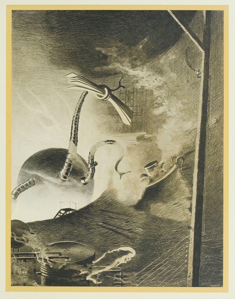 ... les formidables engins, d’une puissance et d’une complexité si grandes et si surprenantes, si peu terrestres par leurs formes tortueuses et bizarres, montaient, sinistres, étranges et vagues, hors des ténèbres, vers la lumière.