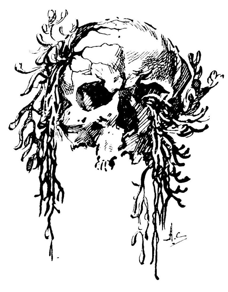 Puis, je repris mon chemin à travers le bois de sapins, en certains endroits enfoncé jusqu’au cou dans l’Herbe Rouge; le cadavre de l’hôtelier du Chien-Tigré n’était plus à la place où je l’avais vu, et je pensai qu’il avait déjà dû être enterré; je revins ainsi chez moi en passant par College Arms. Un homme, debout contre la porte ouverte d’un cottage, me salua par mon nom, quand je passai devant lui.