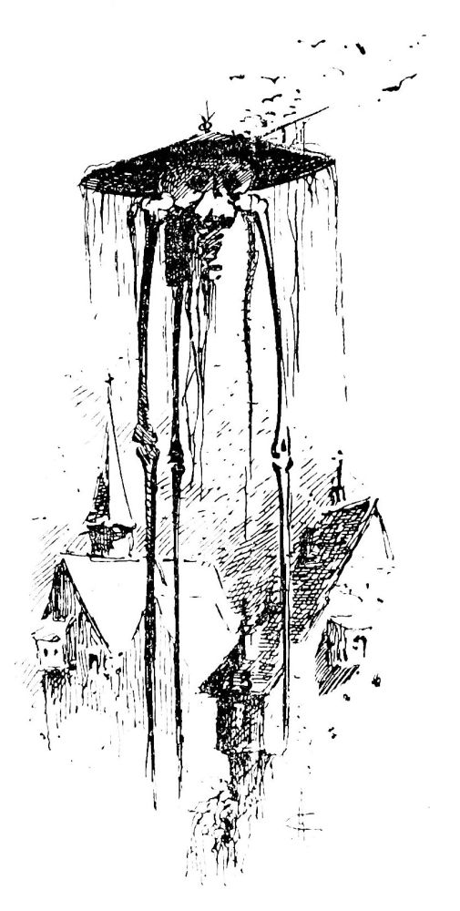 A mi-chemin de la gare de Saint-John’s Wood, je trouvai soudain les restes{213} d’une Machine à Mains. D’abord, je crus qu’une maison s’était écroulée en travers de la route, et ce ne fut qu’en escaladant les ruines que j’aperçus, avec un sursaut, le monstre mécanique, avec ses tentacules rompus, tordus, faussés, gisant au milieu des dégâts qu’il avait faits. L’avant-corps était fracassé, comme si la machine s’était heurtée en aveugle contre la maison et qu’elle eût été écrasée par sa chute. Il me vint alors à l’idée que le mécanisme avait dû échapper au contrôle du Marsien qui l’habitait. Il y aurait eu quelque danger à grimper sur ces ruines pour l’examiner de près, et le crépuscule était déjà si avancé qu’il me fut difficile même de voir le siège de la machine tout barbouillé de sang et les restes cartilagineux du Marsien que les chiens avaient abandonnés.
