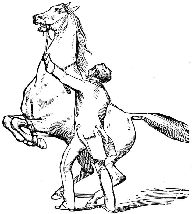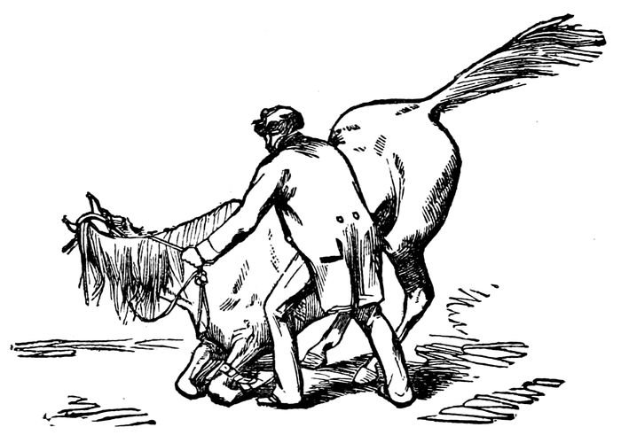 “Care must be taken in teaching this trick, that you have a horse not predisposed to vicious propensities, or you may make a confirmed kicker; and then you will have the habit to break-up. A horse of a mild disposition may be taught to perform thus without the risk of his becoming a kicker. I have taught one of my ponies to kick when I desire him to do so, and he cannot be made to kick unless the whip is used lightly upon his 39hind parts. Having selected your animal, take a pin in your right hand, prick the near hind leg with it and say, ‘Kick with the left foot;’ the animal soon learns to obey. Then proceed with the opposite leg in the same manner. After the horse will kick, with either foot, by a motion of the hand without pricking him you will stand off a short distance, with a long whip in your hand; touch the near hind foot and say, ‘Kick with the left foot;’ then proceed in the same manner with the right foot. By proceeding thus once a day the animal will soon learn to do his part very nicely.”