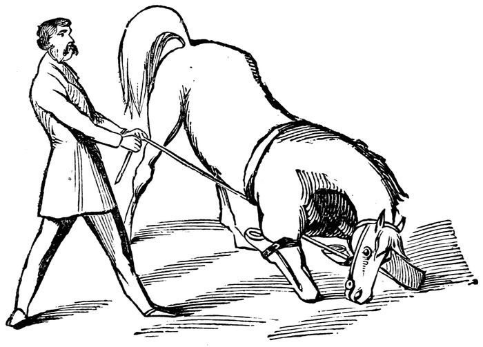 Bend his left fore leg and slip a loop over it, so that he cannot get it down. Then put a surcingle around his body, and fasten one end of the long strap around the other fore leg, just above the hoof. Place the other end under the surcingle, so as to keep the strap in the right direction; take a short hold of it with your right hand; stand on the left side of the horse, grasp the bit in your left hand, pull steadily on the strap with your right; bear against his shoulder till you cause him to move. As soon as he lifts his weight, your pulling will raise the other foot, and he will come on his knees. Keep the strap tight in your hand, so that he cannot straighten his leg if he rises up. Hold him in this position, and turn his head toward you; bear against his side with your shoulder, not hard, but with a steady, equal pressure, and in about ten minutes he will lie down. As soon as he lies down he will be completely conquered, and you 37can handle him as you please. Take off the straps, and straighten out his legs; rub him lightly about the face and neck with your hand the way the hair lies; handle all his legs, and after he has lain ten or twenty minutes, let him get up again. After resting him a short time, make him lie down as before. Repeat the operation three or four times, which will be sufficient for one lesson. Give him two lessons a day, and when you have given him four lessons, he will lie down on your taking hold of one foot. As soon as he is well broken to lie down in this way, tap him on the opposite leg with a whip when you take hold of his foot, and in a few days he will lie down from the mere motion of the whip.