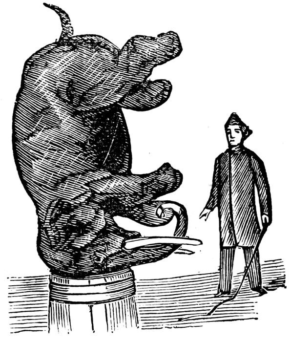 Where the horse obeys a word, that word must be incorporated 40into the question asked, in such a way as to attract his attention. If used too near the commencement of the sentence he will reply before the question is out of your mouth. It is not necessary to use the exact word that he “works” by, provided it sounds to him like it; thus, Yankee Robinson says to his horse during the performance, “I guess you’re as handsome a fellow as these ladies and gentlemen ever saw—don’t you guess so?” The horse nods his head at the emphasized word “guess,” supposing it to be his command “yes.” The next question, perhaps, is, “But others know the most?” In this case the horse, not being posted on Webster, and being guided by the sound, gives his head a negative shake, considering “no” and “know” synonymous.