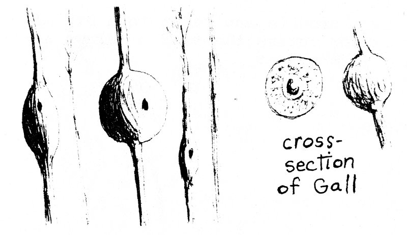 On the dead goldenrod stalks are round and oval-shaped outgrowths known as galls. A gall is an abnormal growth of a plant resulting from an insect or bacterial irritation. The round, one-inch galls are caused by the Eurosta Fly. The long, oval growths contain eggs and larvae from the goldenrod gall moth. Eggs were laid within the stem causing an irritation which stimulated plant cell production. A cozy home 4 formed for the larvae. Before they developed into the flies, they ate their way out—look for the small holes in the old galls.
