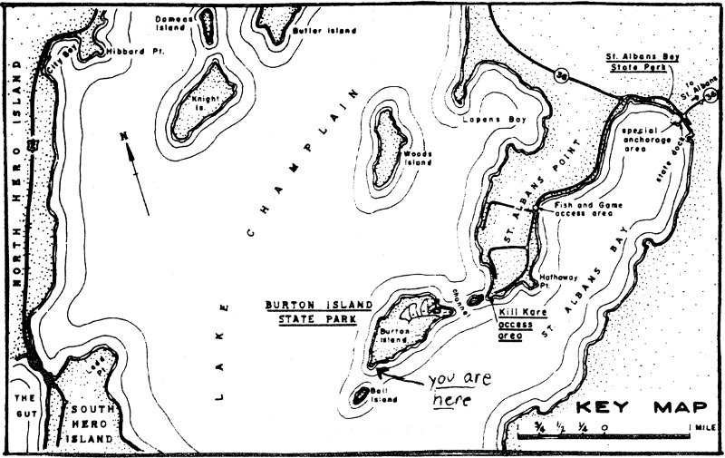 Should you decide upon the scenic hiking trail, follow the trail markers to your left. This trail runs to the end of the island and along some beautiful vistas of Lake Champlain. Turning to page 14, you will find a brief guide which we hope will bring to your attention many of the interesting features along this path.