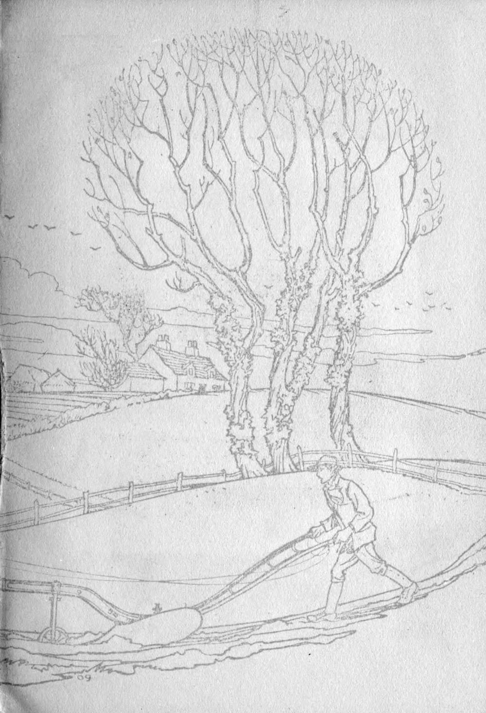 The beeches on the beech-covered hills roar and strain as if they would fly off with the hill, and anon they are as meek as a great horse leaning his head over a gate. If there is a misty day there is one willow in a coombe[20] lifting up a thousand silver catkins like a thousand lamps, when there is no light elsewhere. Another day, a wide and windy day, is the jackdaw’s, and he goes straight and swift and high like a joyous rider crying aloud on an endless savannah, and, underneath, the rippled pond is as bright as a peacock, and millions of beech leaves drive across the open glades of the woods, rushing to their Acheron. The bush harrow stripes the moist and shining grass; the plough changes the pale stubble into a ridgy chocolate; they are peeling the young ash sticks for hop poles and dipping them in tar. At the dying of that windy day the wind is still; there is a bright pale half-moon tangled in the pink whirl of after-sunset cloud, a sound of blackbirds from pollard oaks against the silver sky, a sound of bells from hamlets hidden among beeches.