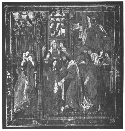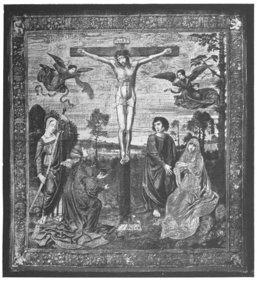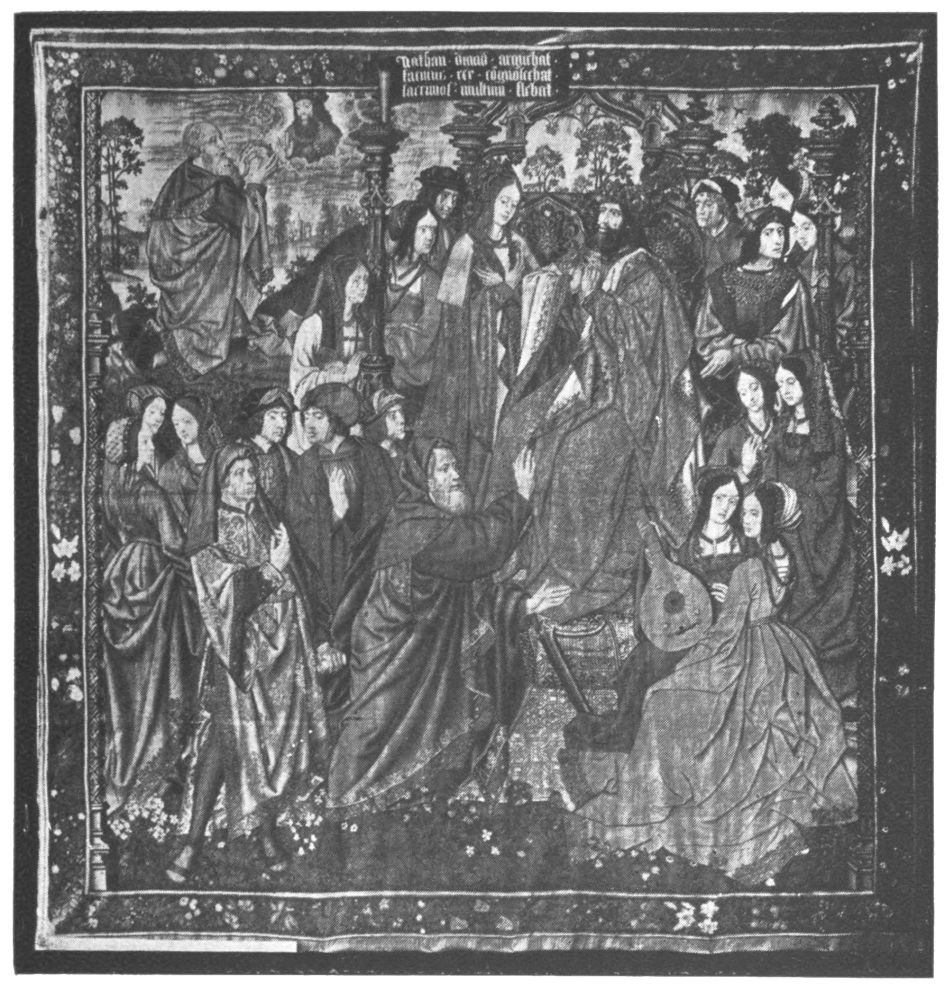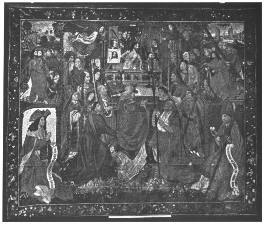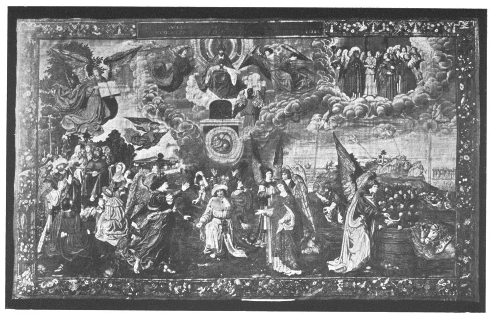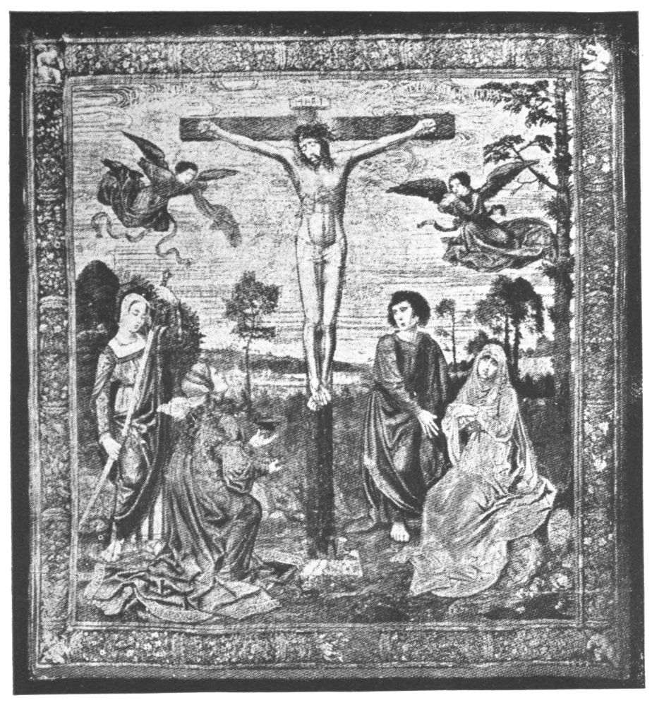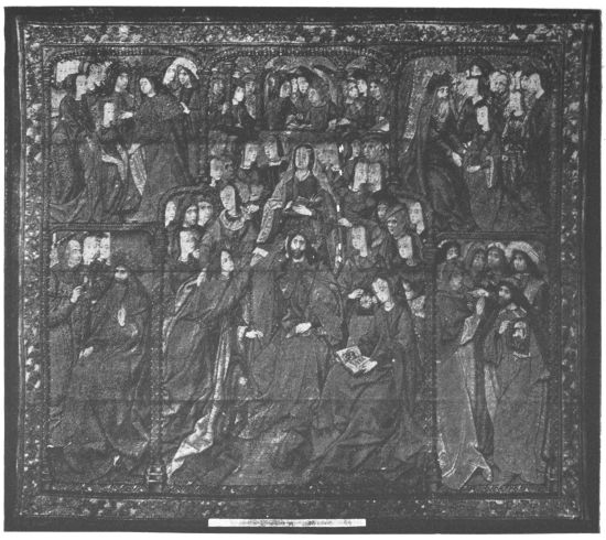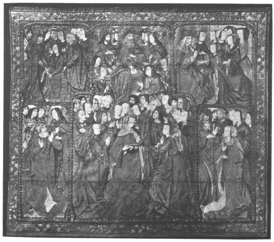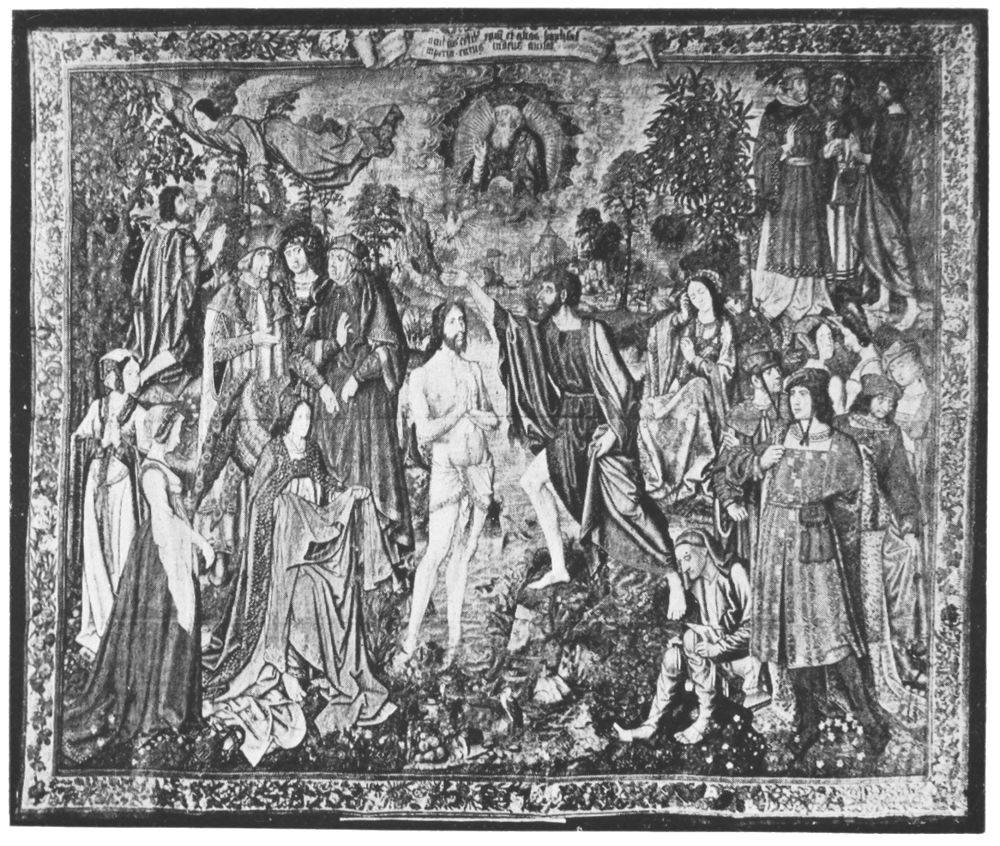 A panel of Spanish tapestry, obviously intended for altar decoration, has recently been discovered that dates from the early fifteenth century. The centre is occupied by the figure of John the Baptist bearing the Paschal Lamb, flanked by St. Martin of Tours in the dress of a bishop, and by St. Hugh of Grenoble. Gold and silver threads are employed, and the arms are shown of Martin of Aragon and of his wife, Maria de Luna, who died in 1407. This king appears to have interested himself in tapestries, and we read that the walls of the royal palace at Saragossa were adorned with these costly fabrics at his coronation in 1398. King John of Aragon before him had introduced, we read in a document dated 1388, a company of “brobadors de Brabant.{9}”