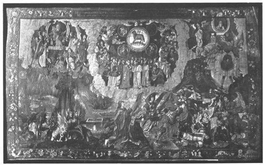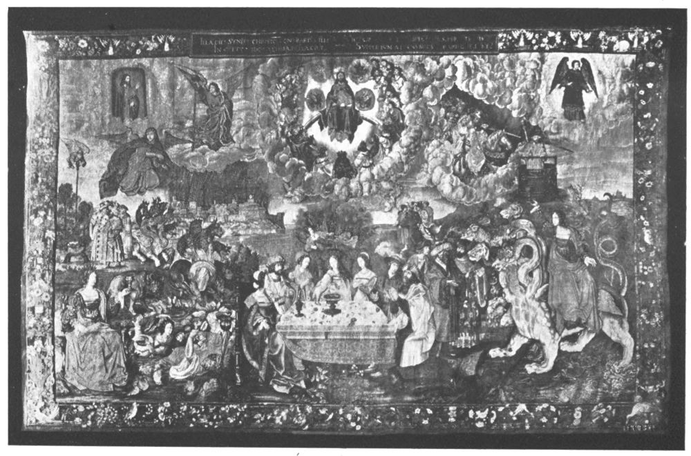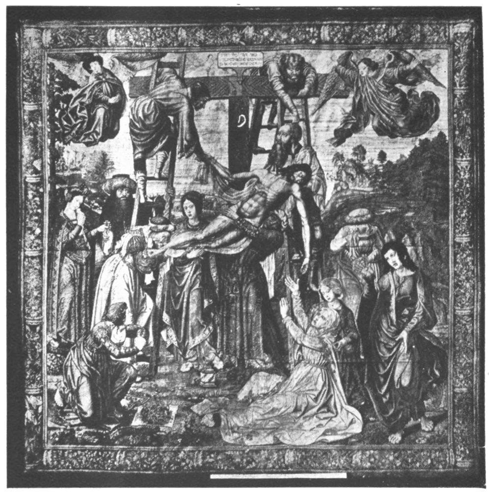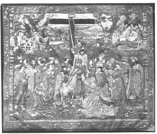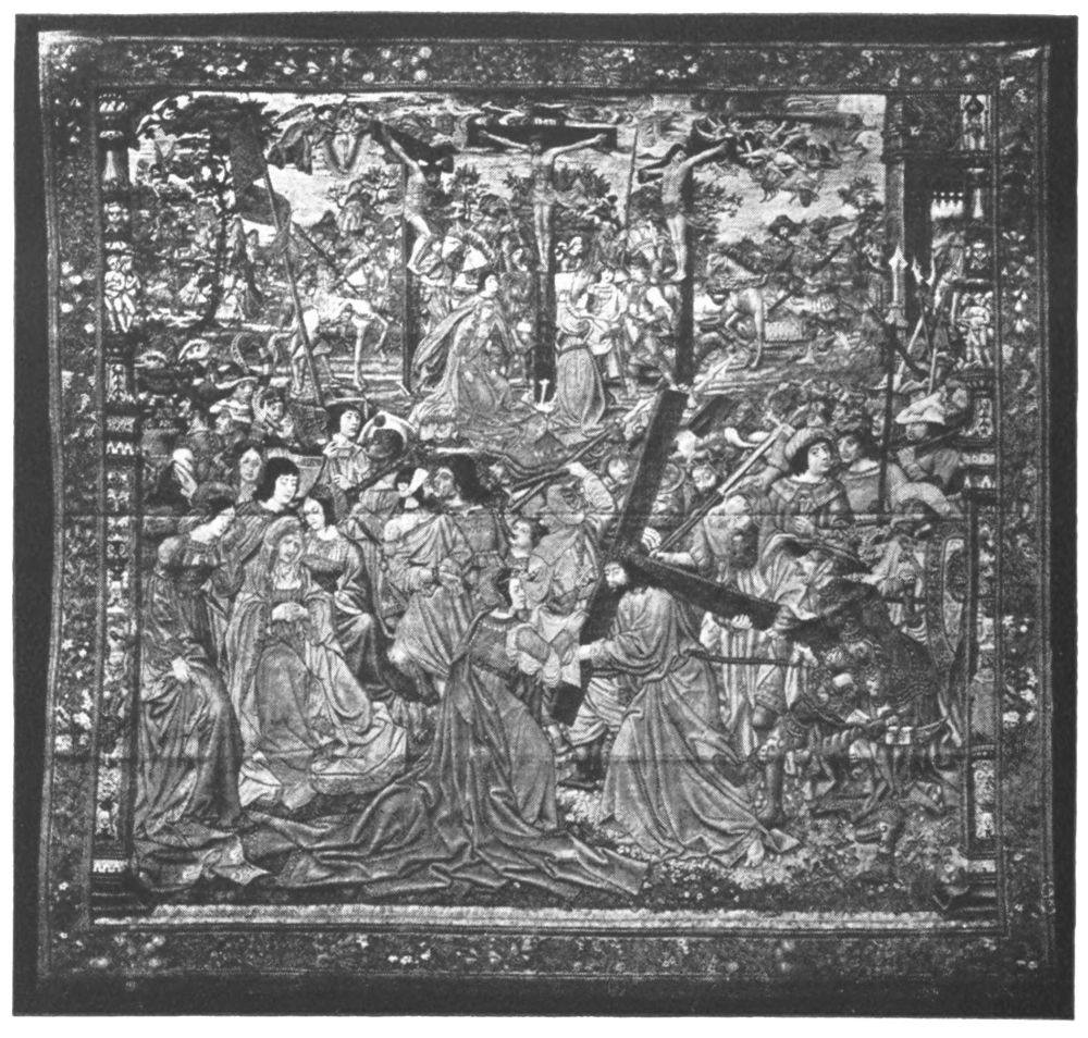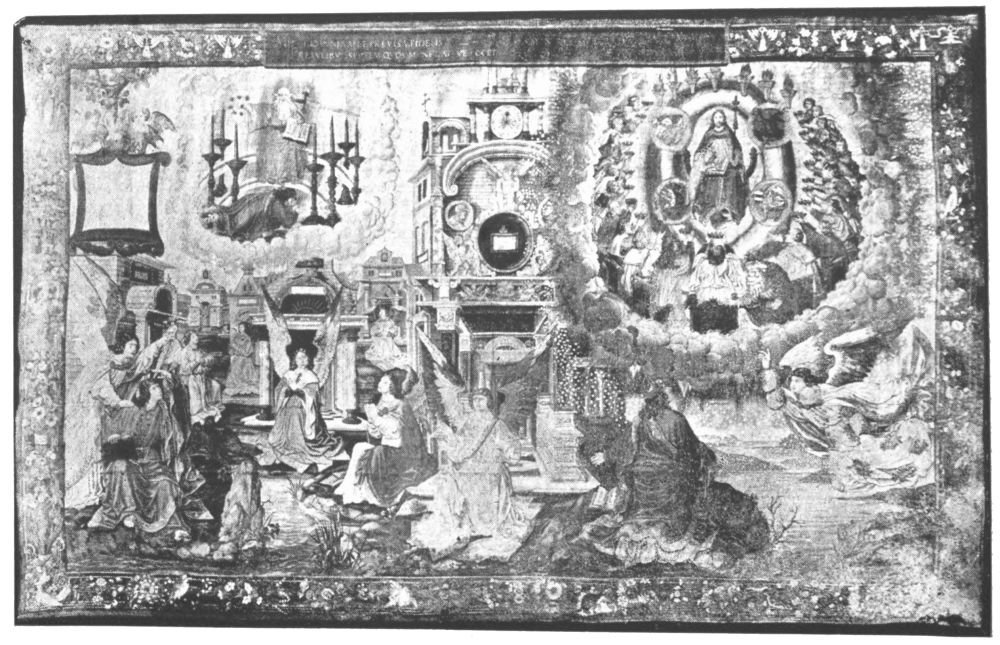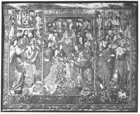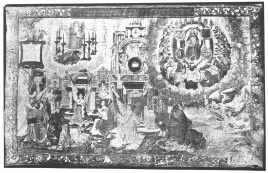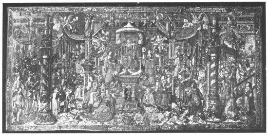 The Mass of St. Gregory the Great. Neither the designer of the cartoon nor the town where this tapestry was woven is known. It is of Flemish{21} origin, and the Gothic arches, each enclosing a scene in the life of Christ, point to Bruges as its place of origin. It is mentioned by Ferdinand V of Aragon in the Act of Discharge of Juan Valazquez (1555) as a gift from the Princess Juana to her mother, Queen Isabel the Catholic.