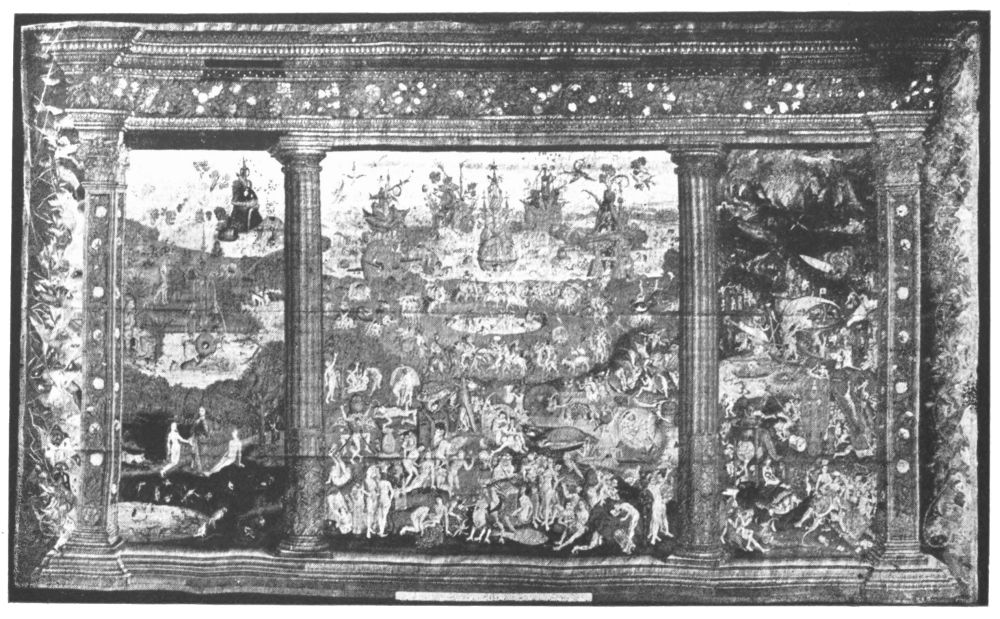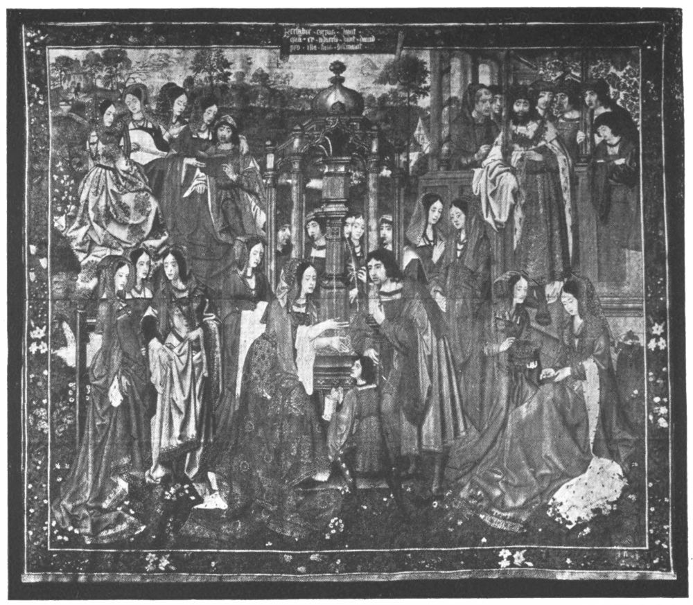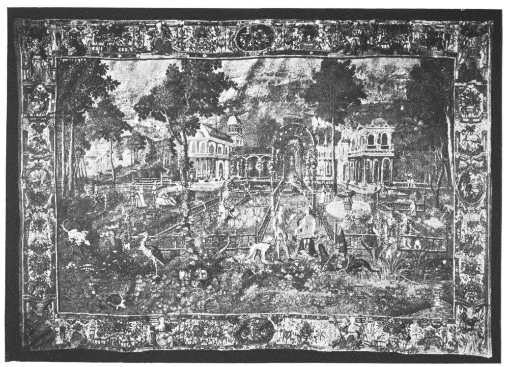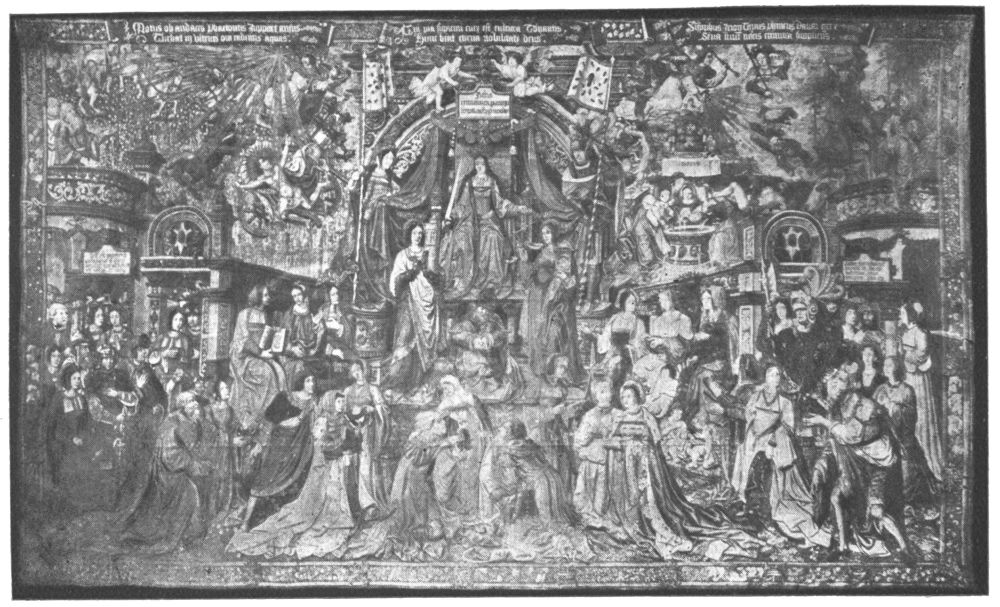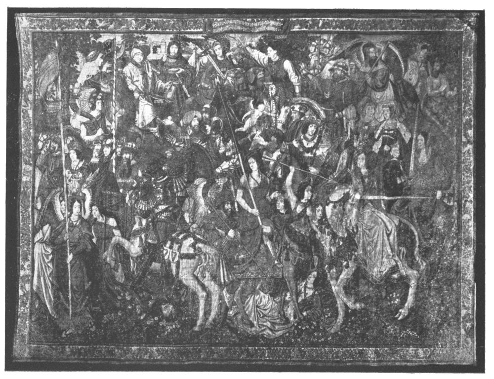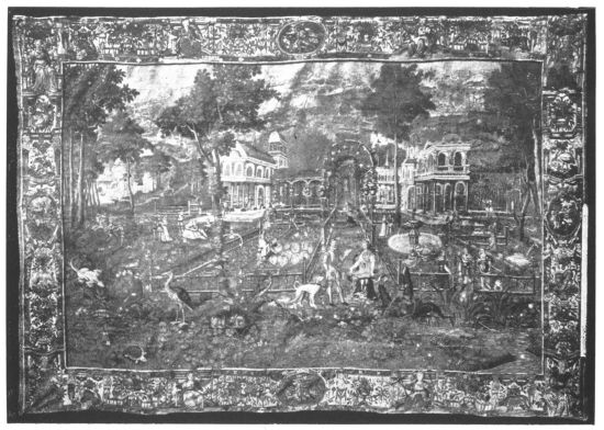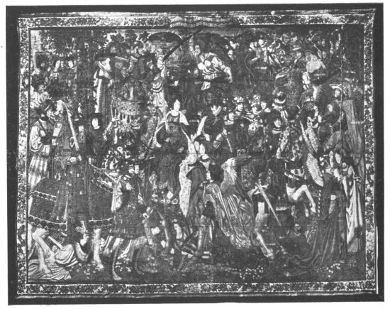 In 1903 an excellent series of photographic plates representing the finest of the tapestries was published in book form, accompanied by critical and historical notes from one of the finest art critics of Spain—the Count Valencia de Don Juan. It is to this learned and discerning writer that I am most indebted for the explanatory notes which accompany the reproductions included in this volume. The tapestries are, as far as possible, treated in groups connected by similarity of subject except where several pieces form a continuous series.{18}