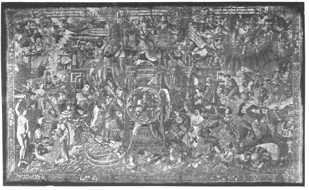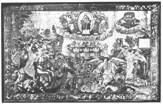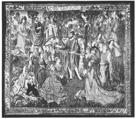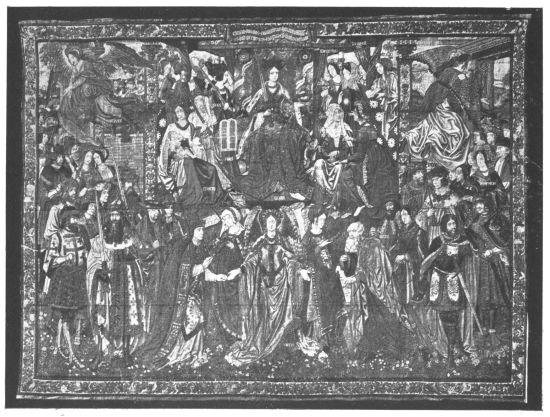 IT is a notable fact that the earlier Gothic tapestries—those of the thirteenth and fourteenth centuries and earlier—nearly all deal with religious subjects. From this we are apt to acquire an exaggerated idea of the part played by religion in mediæval life. The true explanation is that in the cockpit of Europe during these fierce and warlike times art in any form found itself unable to exist. Only in the monasteries could it find refuge, and these became the centres, not only of the fine arts, but also of textile arts like tapestry-weaving. The effects of this monopoly were unfortunate. The imagination of the designers of cartoons was stunted. They came to believe that the duty of tapestry was not to delight the eye, but to preach trite little sermons. Hence the endless series of pictures extolling the practice of vices. The chief beauty of the earlier Gothic tapestries lay in the brilliance and richness of{19} the dyes. But as the times became less barbarous, and art began to flourish outside the monastery and the cathedral close, the Gothic tapestries gained a new vigour and beauty. The religious inspiration remained, giving, indeed, an atmosphere of chastened restraint that to many people denotes the high-water mark of the art. But the incursions of the outer world could no longer be restrained, and we get the delightful posies of spring flowers, the bluebells, daisies, lilies, and primroses—the millefleurs—all utterly irrelevant and charming, that intrude into fierce battle scenes and into the mystic visions of the Apocalypse.