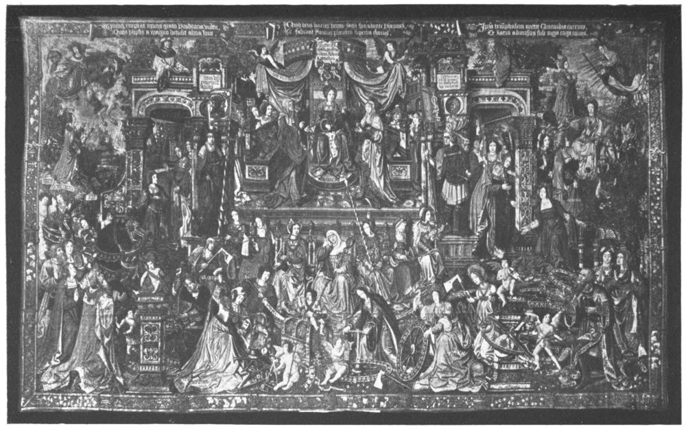 The accumulated treasures of the Spanish Court had remained for many years neglected and uncatalogued, their history and origin uncertain or unknown. It was King Alfonso XII who first conceived the idea of arranging the royal tapestries, studying their history, discovering, where possible, their designers and makers, and classifying them into groups and series, and making photographs of the whole collection. This work was subsequently completed by the late Queen Isabella of Spain.