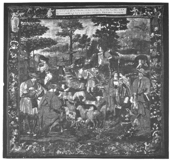 The Birth of Christ is probably one of the oldest pieces of the whole collection. It is mentioned for the first time as forming part of the collection left by Juana the Mad, who died at Tordesillas in 1555. Neither the designer nor the weaver can be identified. “The Gothic architecture of the buildings in the background,” says the Count{20} Valencia de Don Juan, “the attitude of the persons, the singularity and richness of their costumes, and, above all, the drawing, recalls the tapestries which were made at Arras in the fifteenth century.”