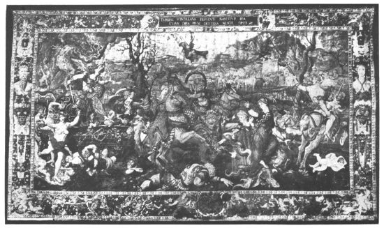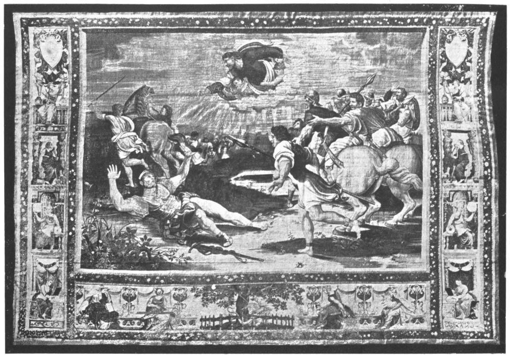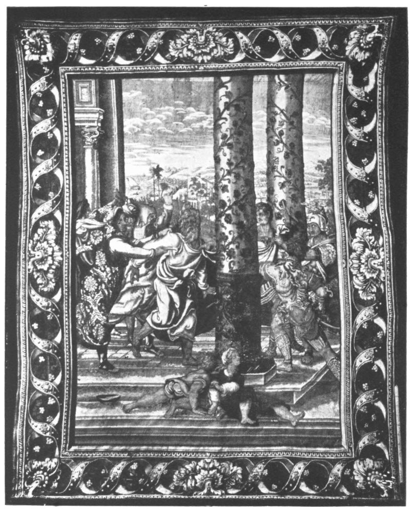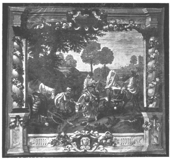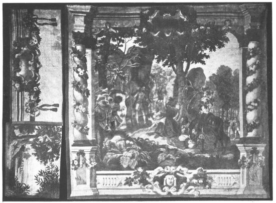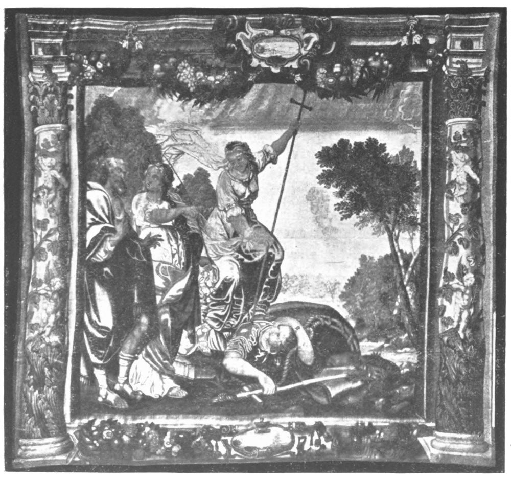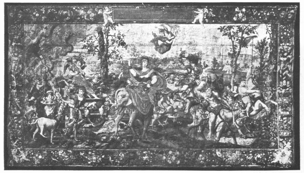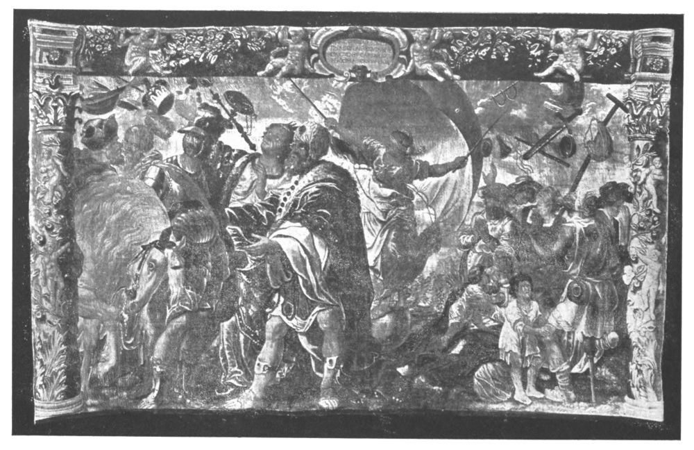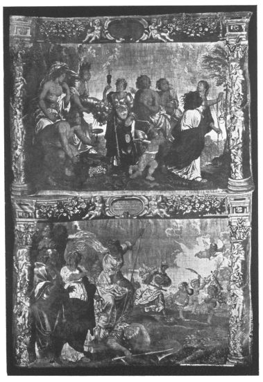 The designer of the series in the royal collection is unknown. It is a fine example of the florid art of the Renaissance. The borders are especially fine, containing medallions supported by nymphs and satyrs garlanded with fruit and flowers. In{65} the orders of two of the plates are monograms of silk and gold similar to that in Les Noces de l’Empereur Otton in the National Museum at Munich. Coats-of-arms are seen on the scrolls that surmount the panels. In the centre are the arms of Colonna with a ducal crown; to the right a chequered shield with argent and purple squares; to the left an escutcheon carrying two wolves.