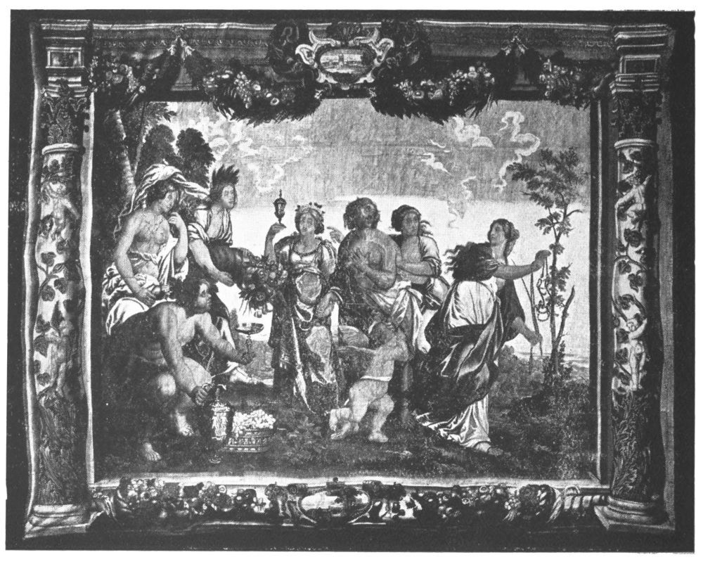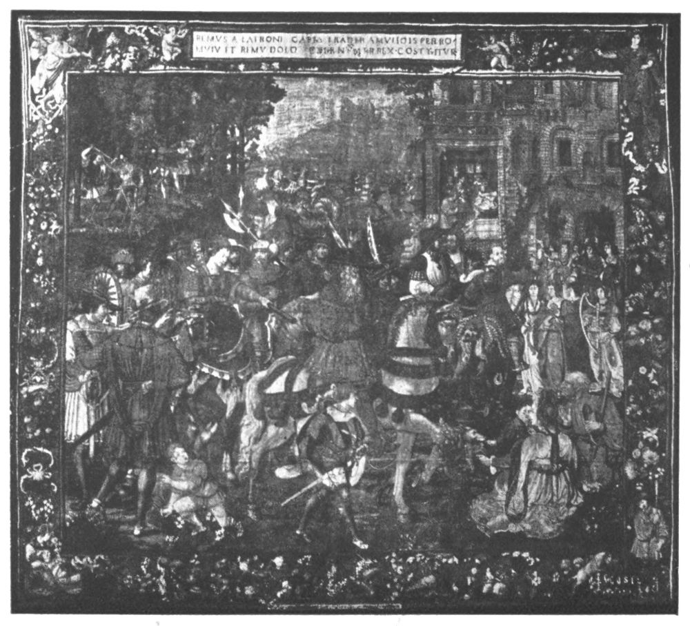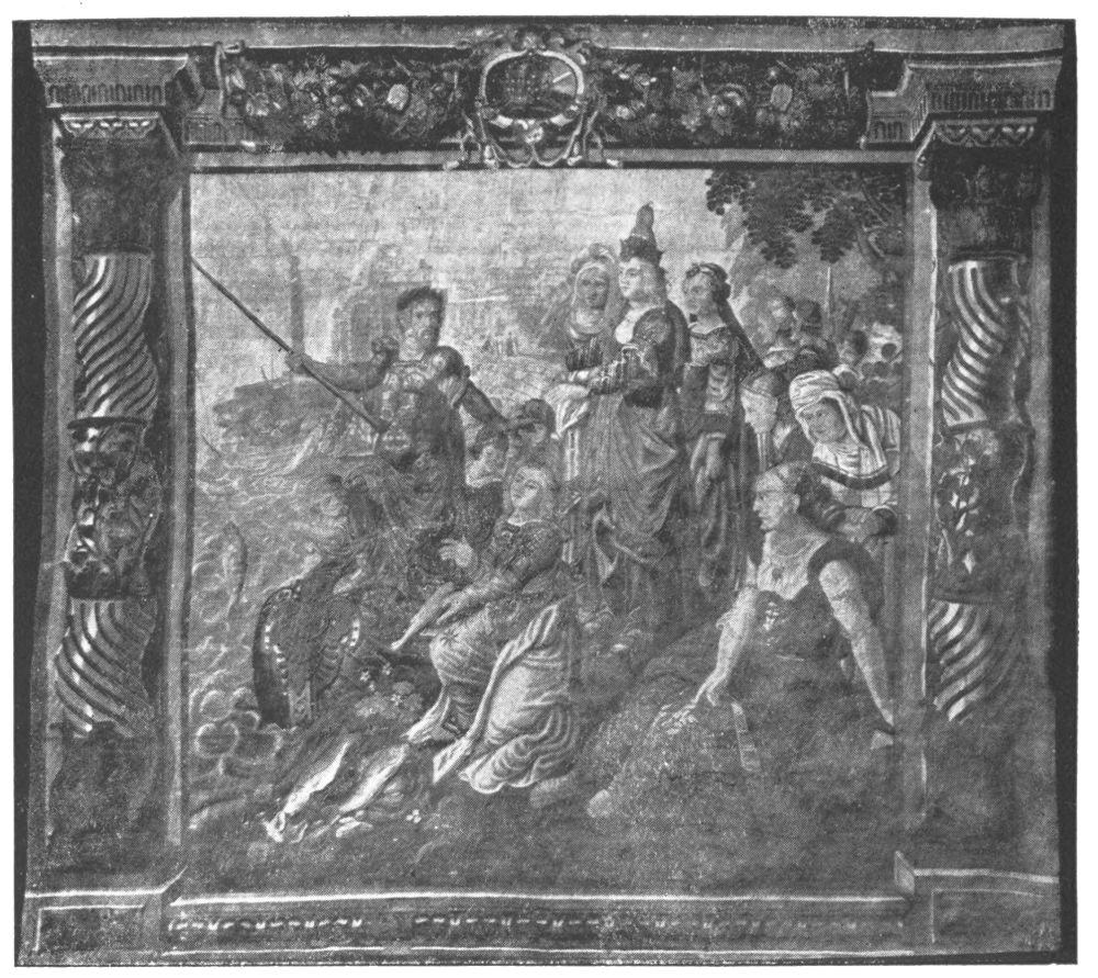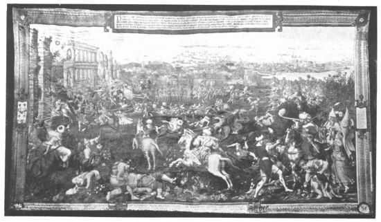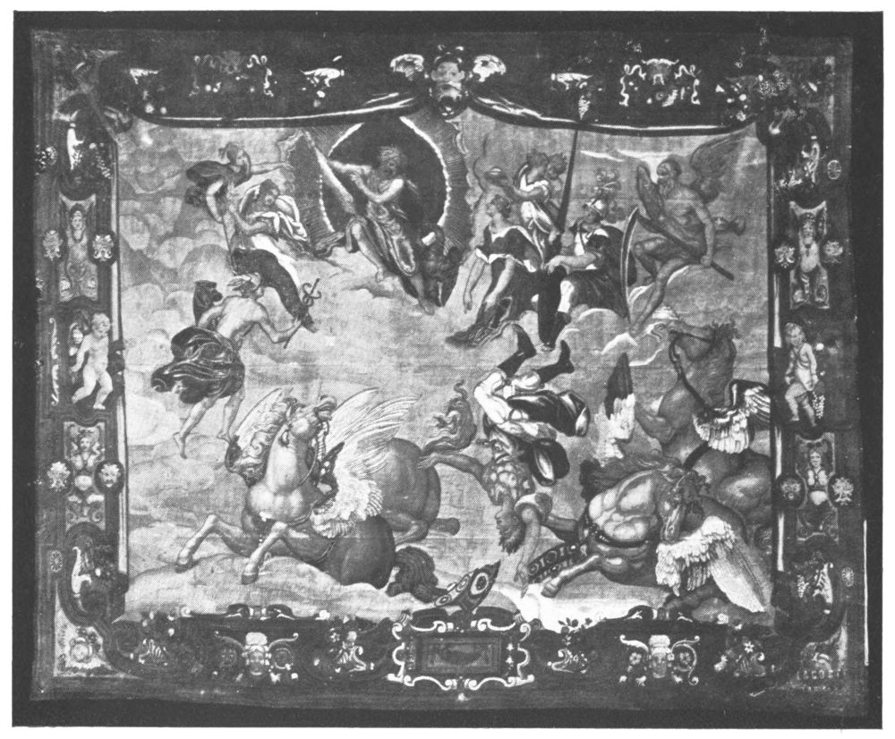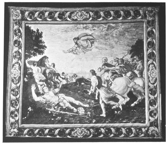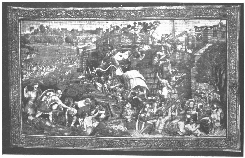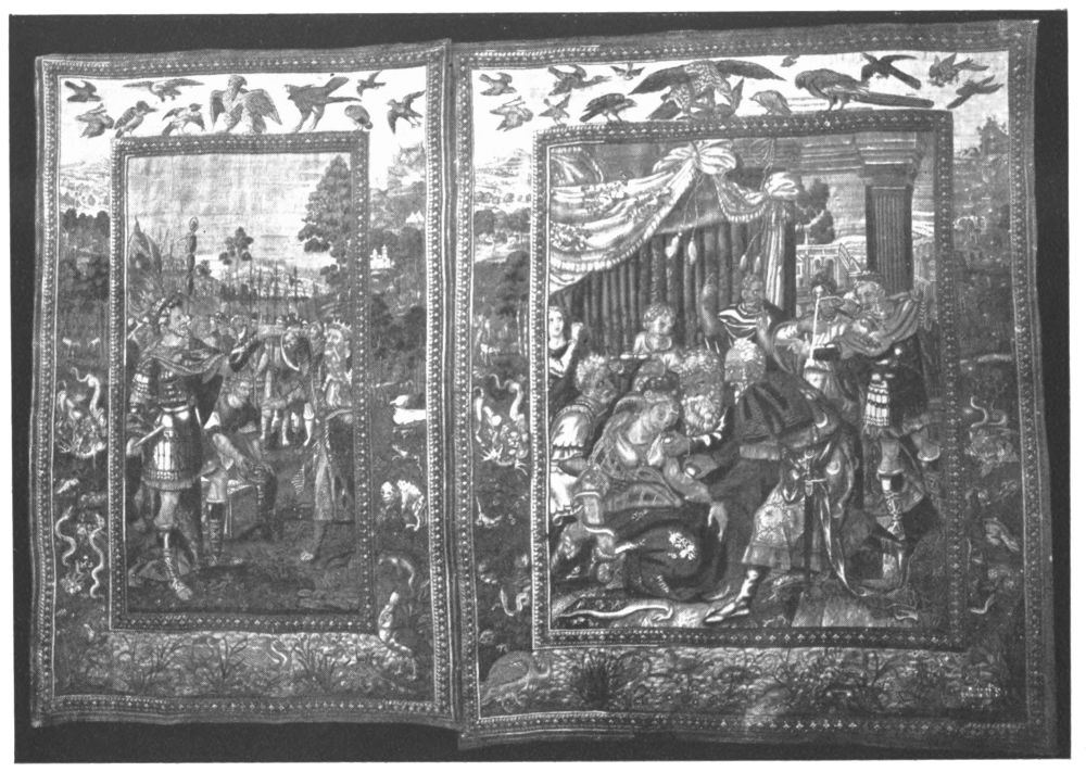The designer of the series in the royal collection is unknown. It is a fine example of the florid art of the Renaissance. The borders are especially fine, containing medallions supported by nymphs and satyrs garlanded with fruit and flowers. In{65} the orders of two of the plates are monograms of silk and gold similar to that in Les Noces de l’Empereur Otton in the National Museum at Munich. Coats-of-arms are seen on the scrolls that surmount the panels. In the centre are the arms of Colonna with a ducal crown; to the right a chequered shield with argent and purple squares; to the left an escutcheon carrying two wolves.