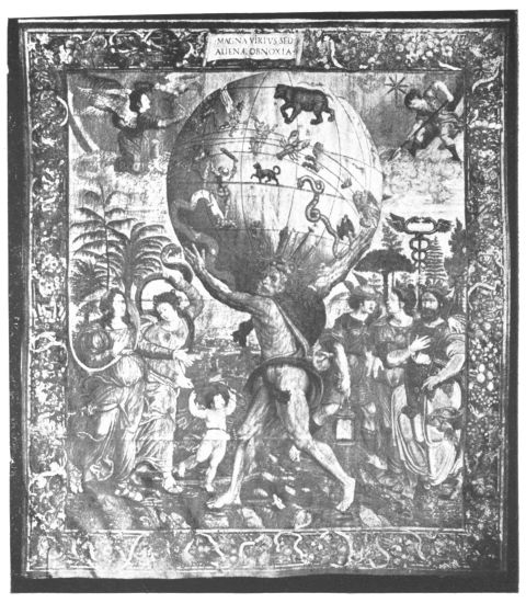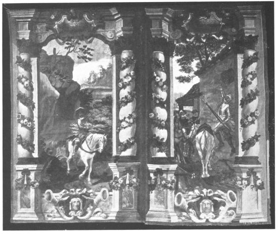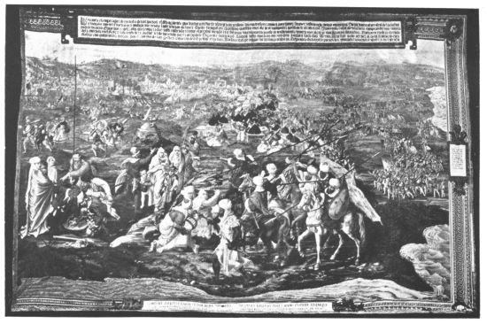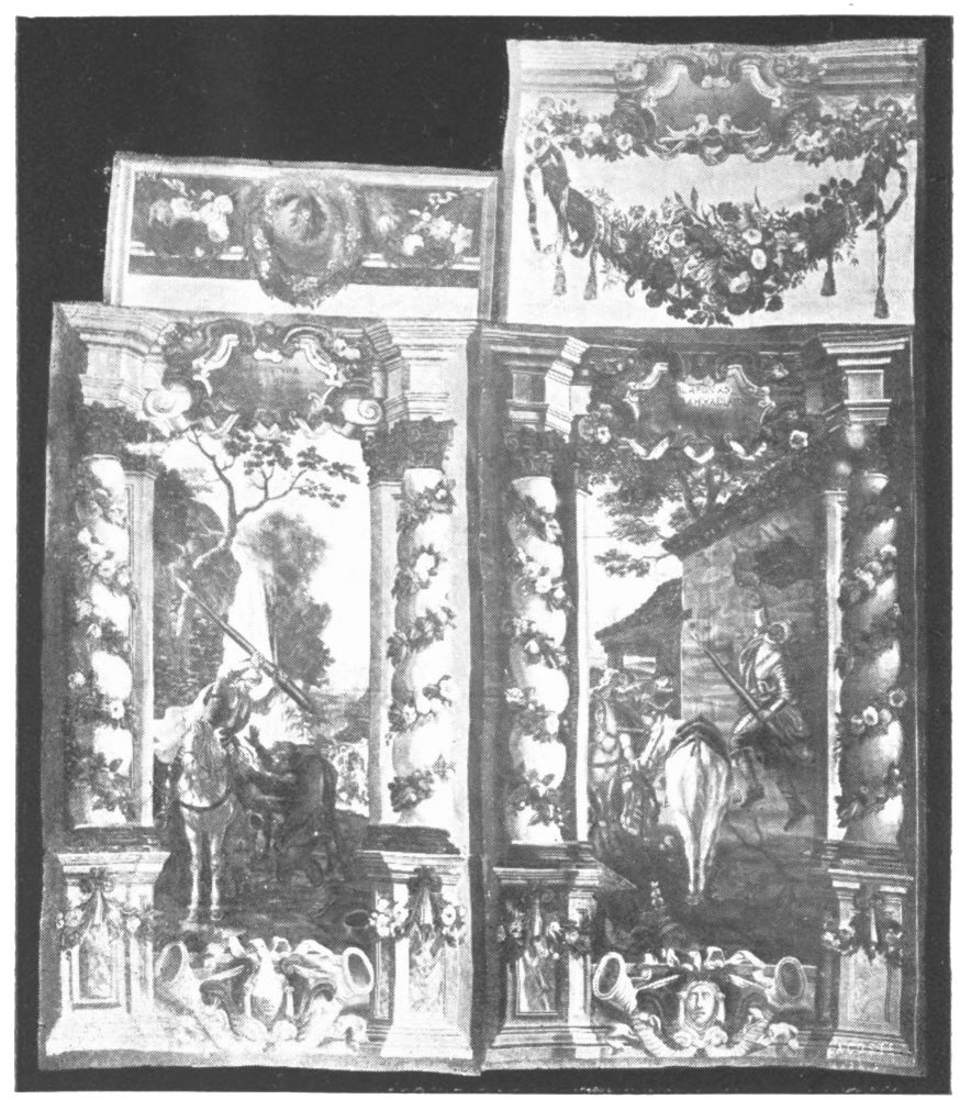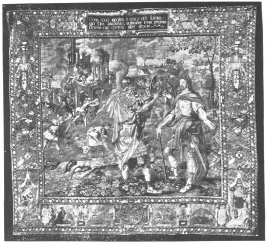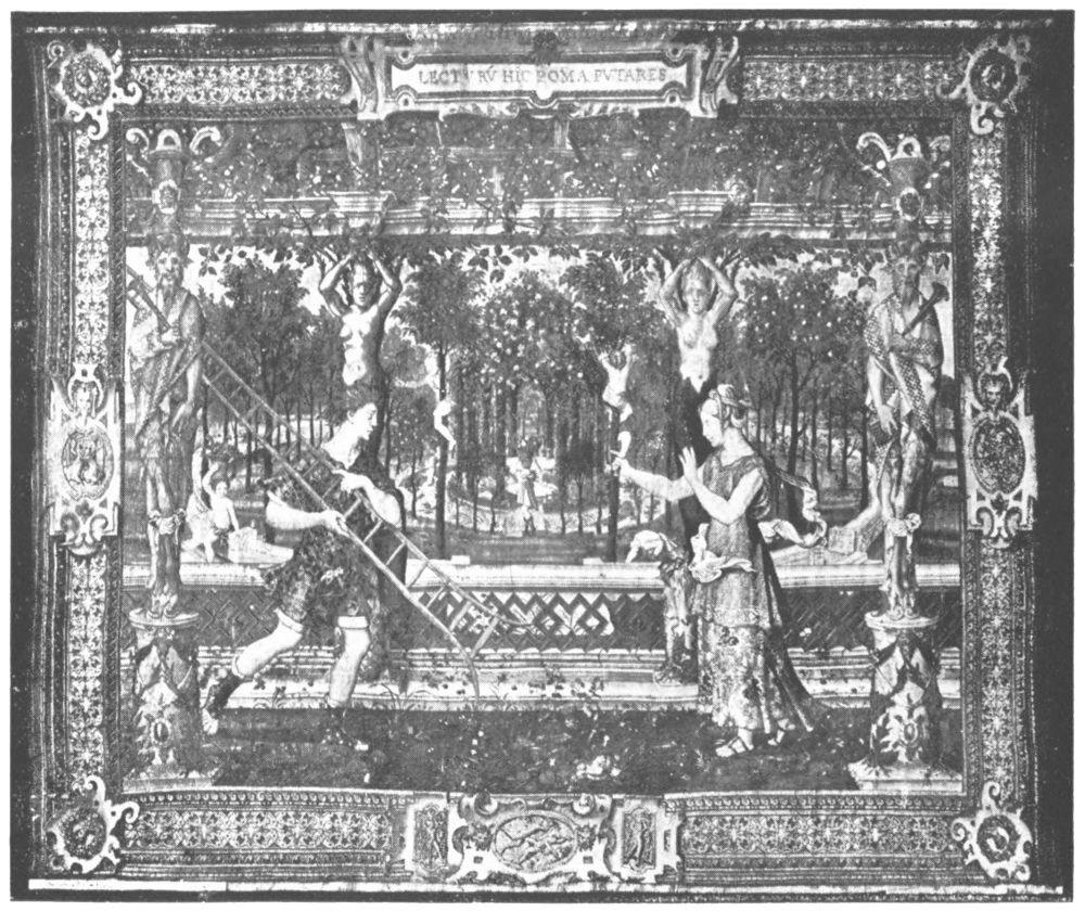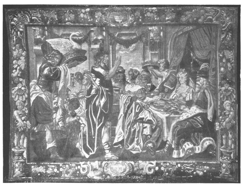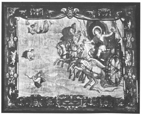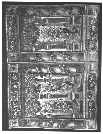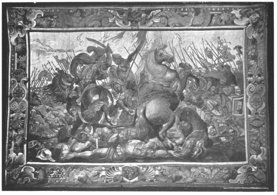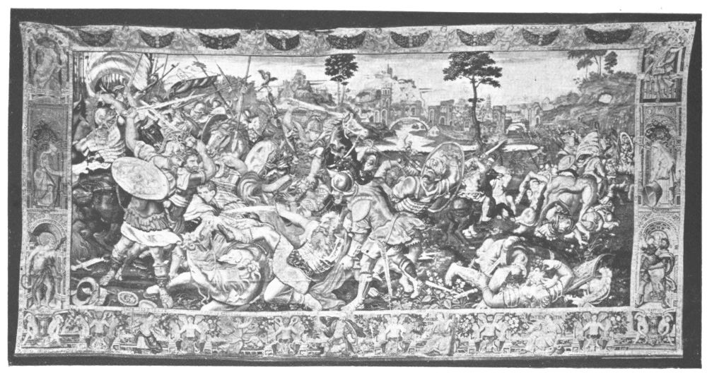 The designer of the series in the royal collection is unknown. It is a fine example of the florid art of the Renaissance. The borders are especially fine, containing medallions supported by nymphs and satyrs garlanded with fruit and flowers. In{65} the orders of two of the plates are monograms of silk and gold similar to that in Les Noces de l’Empereur Otton in the National Museum at Munich. Coats-of-arms are seen on the scrolls that surmount the panels. In the centre are the arms of Colonna with a ducal crown; to the right a chequered shield with argent and purple squares; to the left an escutcheon carrying two wolves.