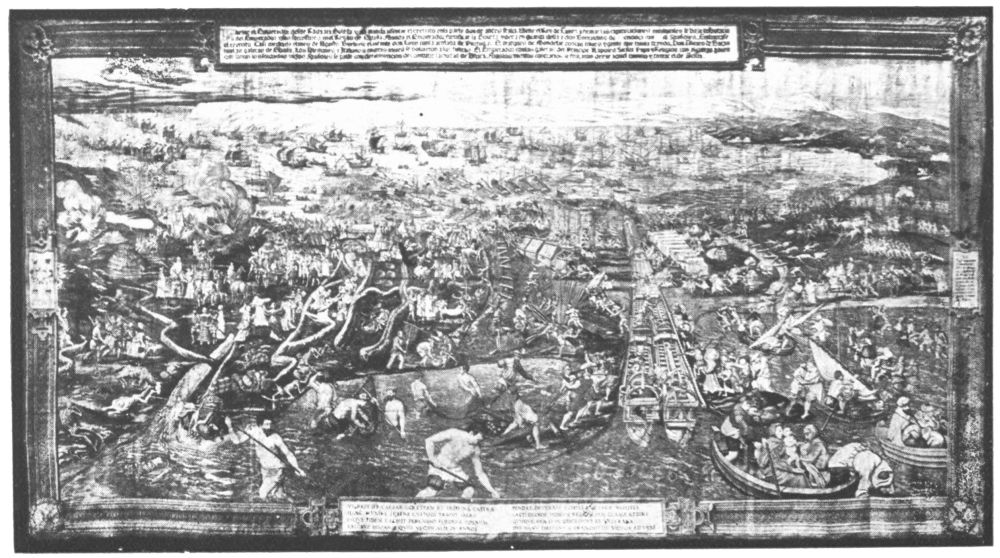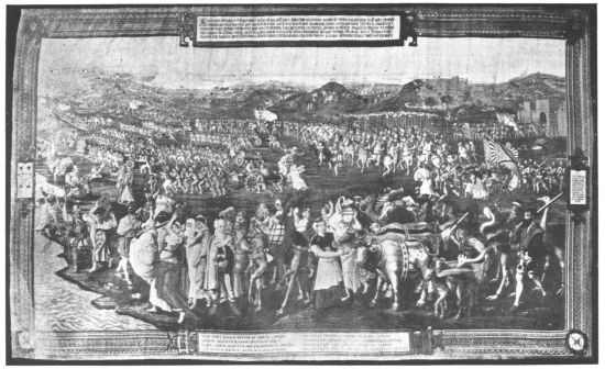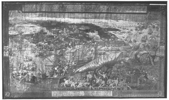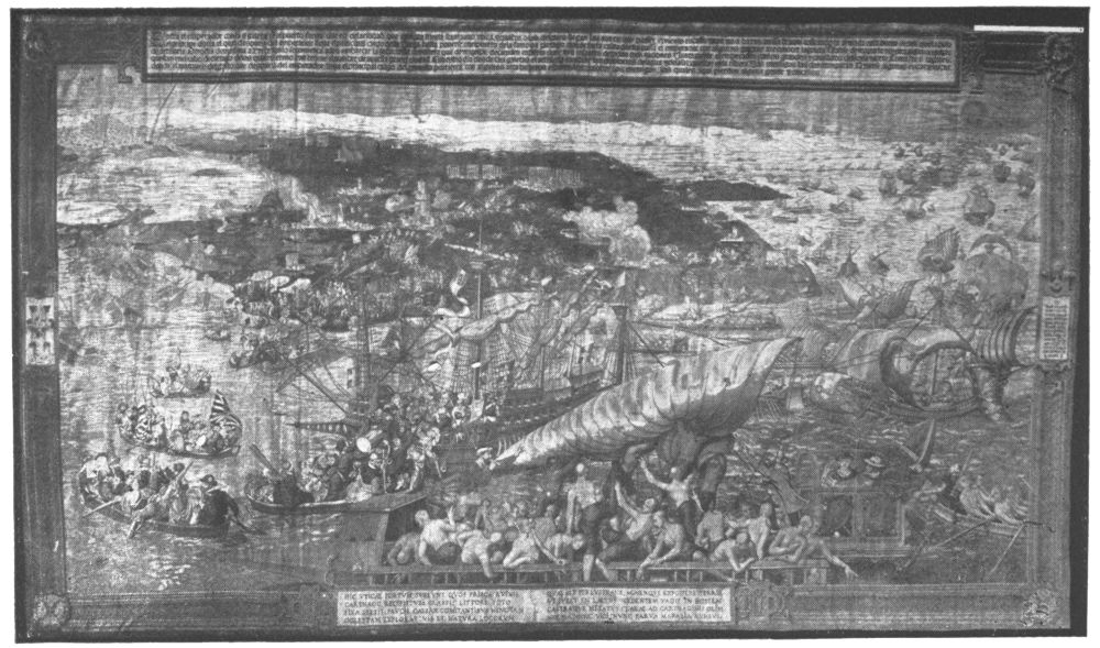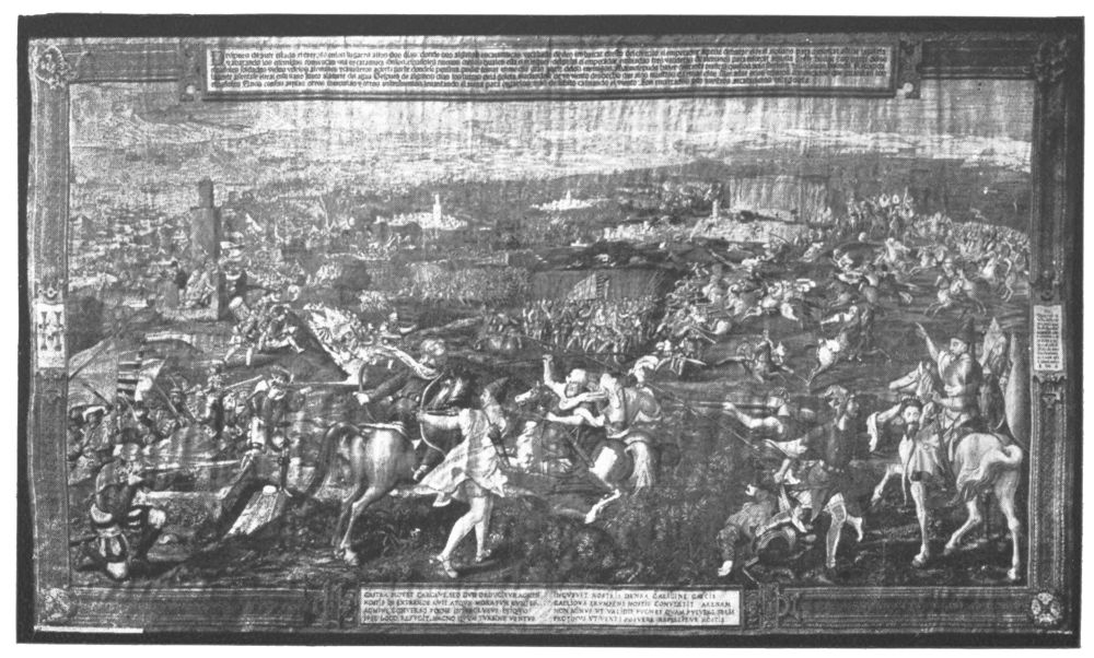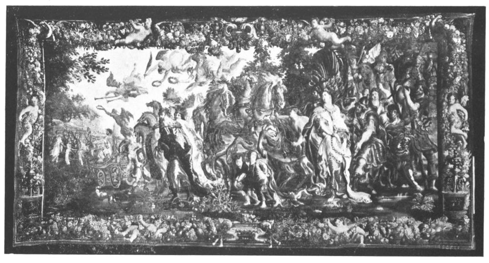 The Tunis Series was completed in 1554. The Tapestries were displayed in England on the occasion of the marriage of Philip and Mary in that year, and were not seen again in this country until 360 years later. They subsequently figured in all the great functions of the Spanish Court, and it was due to the Emperor’s fear that constant usage would injure the fabrics that a duplicate set, but on a smaller scale, was woven. The twelve pieces were again reproduced, on the same scale as the original frames, in 1740 by order of Philip V. A third copy is preserved in the Museum at Vienna, and a fourth, woven{ix} by Pannemaker, was found by the Maréchal de Contades in a castle near Mecklin during the Seven Years War.