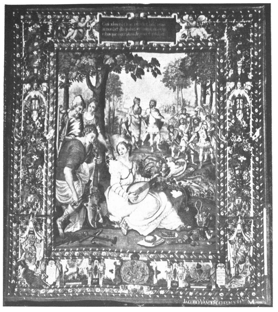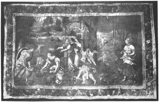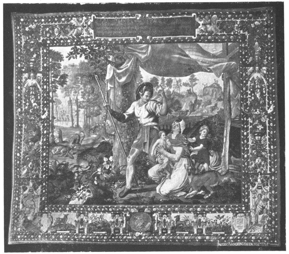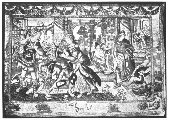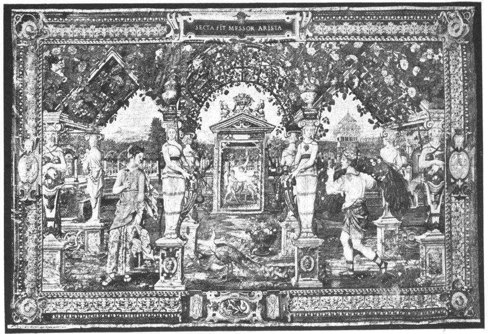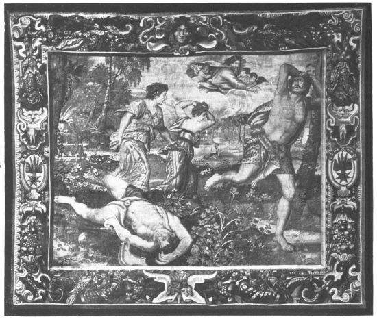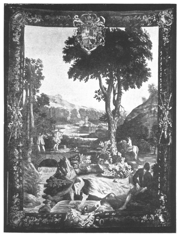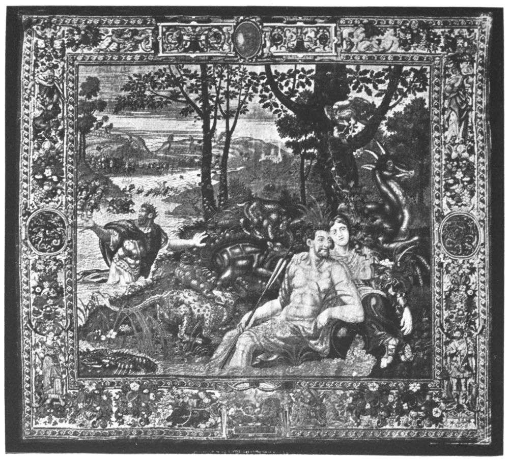 Despite an occasional lapse in drawing, this series of tapestries is one of the finest examples of pure Renaissance workmanship to be found in the Spanish royal collection. The story, of course, is taken from Ovid, and was a favourite one with the Flemish weavers. The tapestries show the{59} true Renaissance love of the open country and lovely gardens with a wealth of flowers and foliage. They are purely decorative in intention, and the figures are merely accessory.