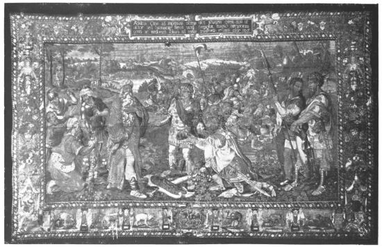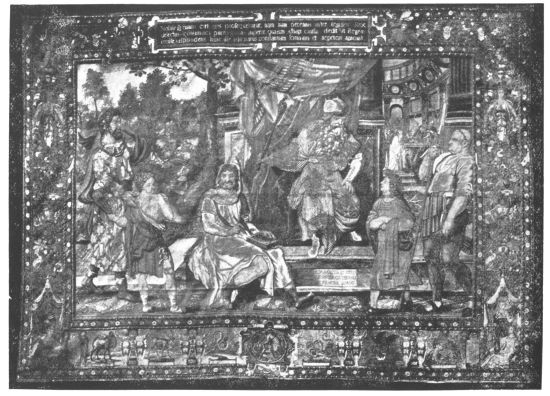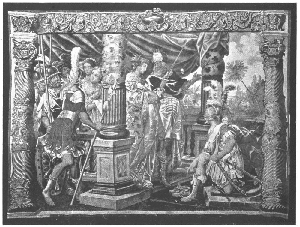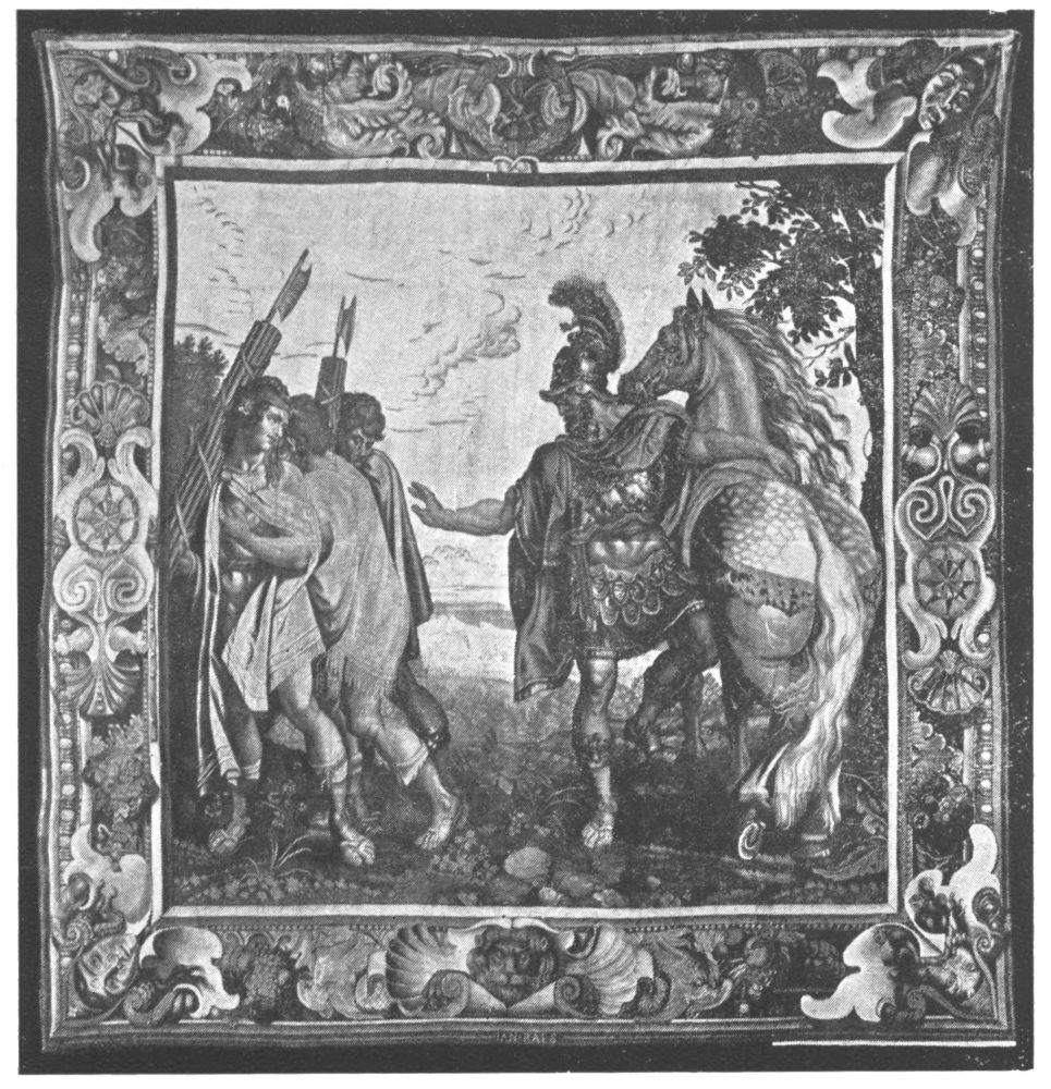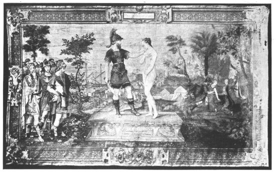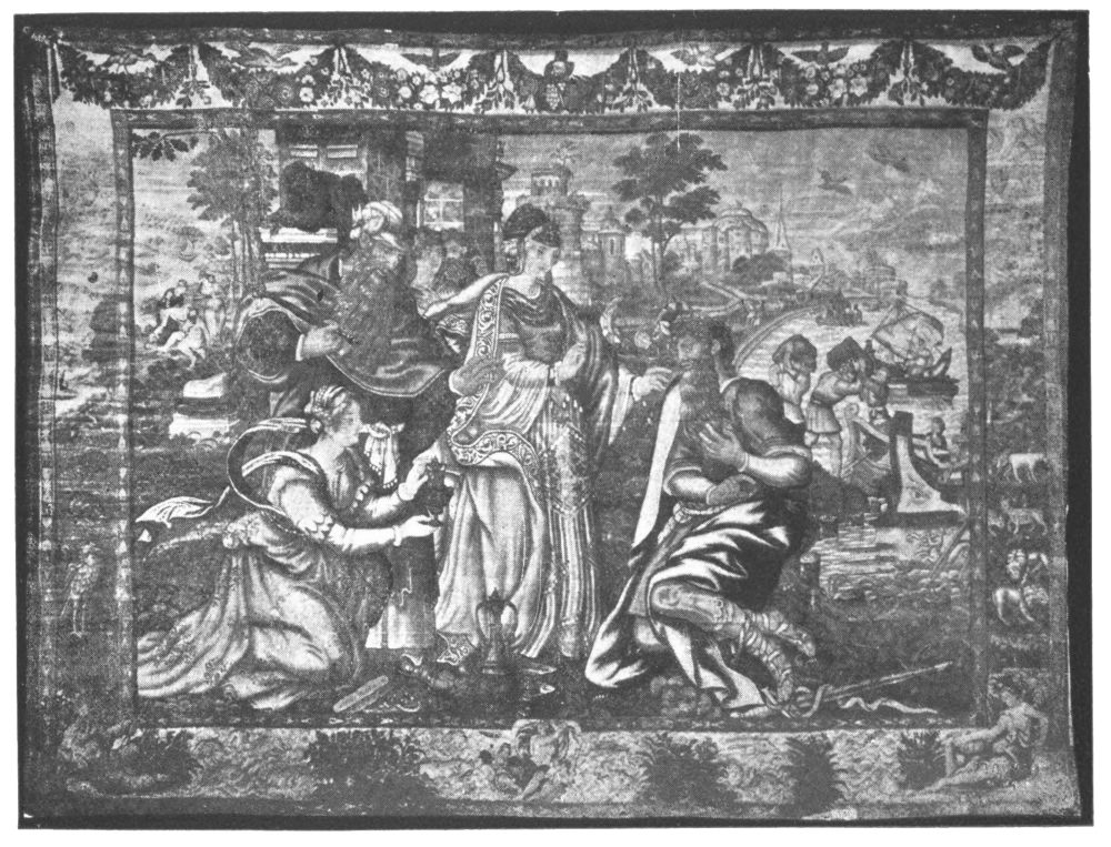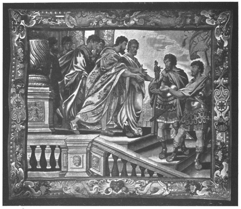 This fine series of tapestries offers an interesting contrast with the other historical series already described, The Conquest of Tunis. The story of Scipio is in pure Renaissance style, and though the designer of the cartoons is unknown, they show very strongly the influence of Giulio Romano, and may even have proceeded from his pencil.{60} Only one piece of the tapestry bears a weaver’s mark, which has not been deciphered. They were inherited by Charles V. from his sister, Mary of Hungary, on her death in 1558.