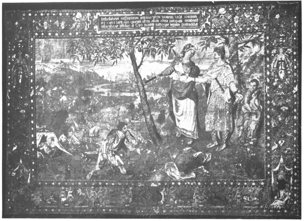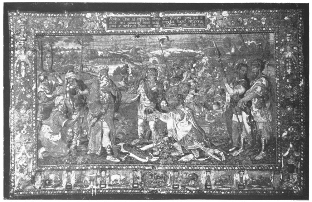 The tapestries represent episodes in the life of the great Persian conqueror, and certain of the legends that were current about his parentage. The designer of the cartoons seems to have followed the Thucedidean account of the delivering of the boy Cyrus to a shepherd, and his subsequent recognition by Astyages. Cyrus’s wars against the people of Lydia and his capture of Crœsus are, of course, historic. There is a legend related by some of the early historians that Cyrus desired to put Crœsus to death at the stake, a proceeding which would have been directly contrary to the principles of the Zoroastrian religion. The designer of the tapestries appears to have got hold of a distorted form of this story in the fifth panel of this series.