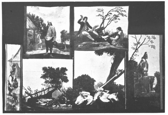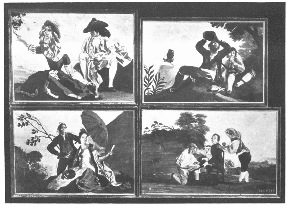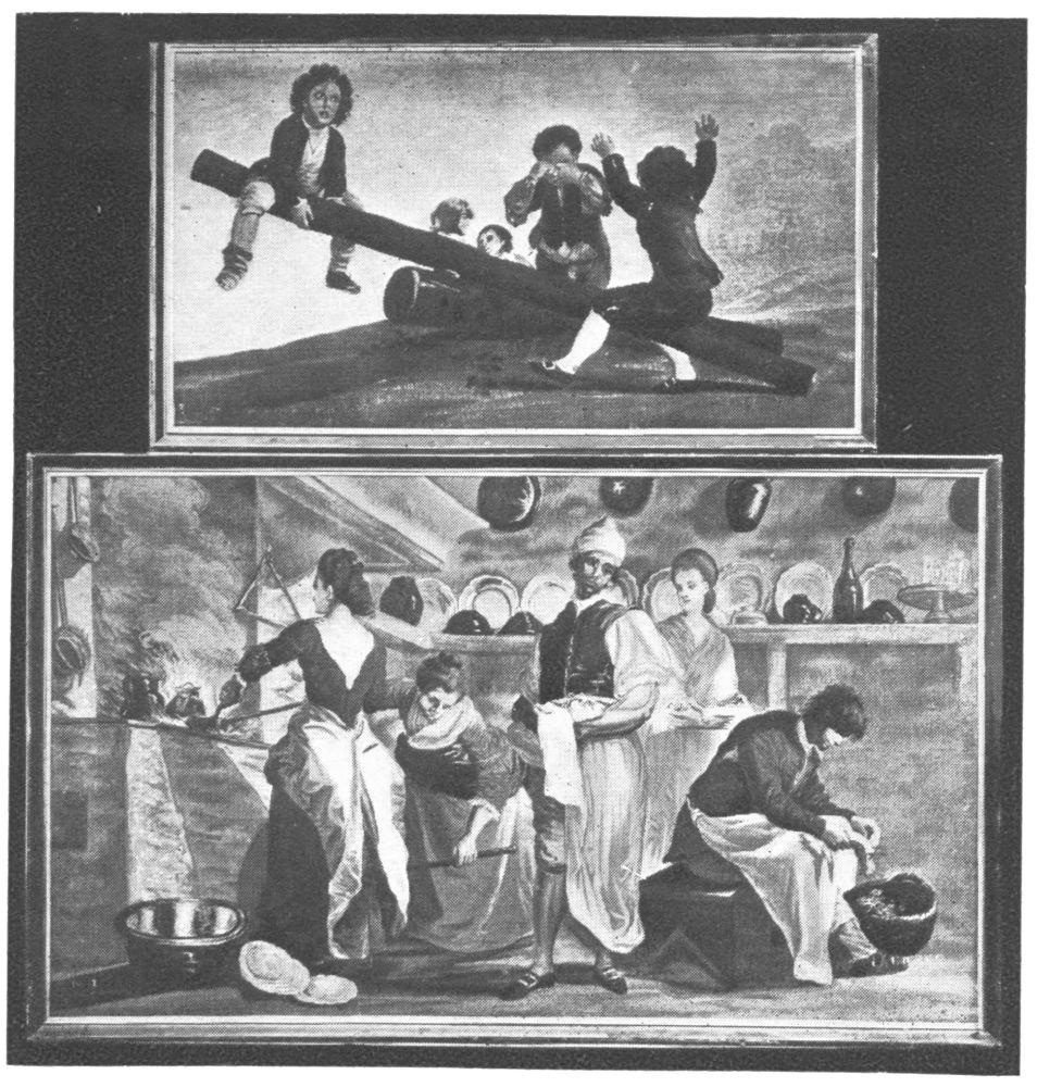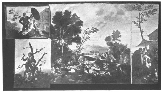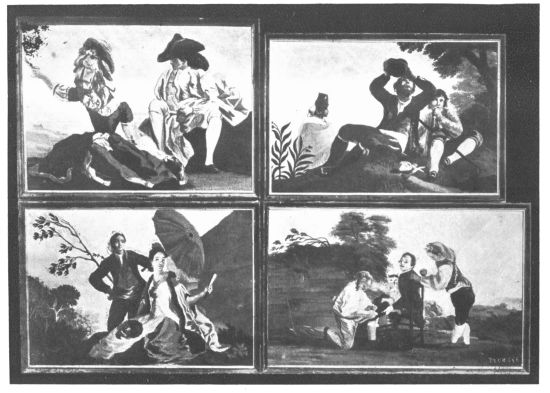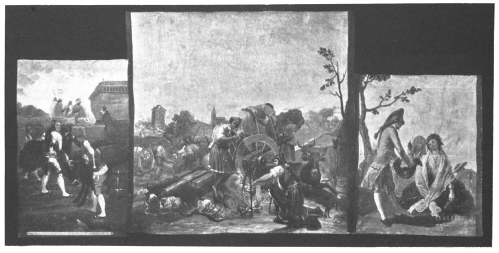 This collection of Spanish Royal Tapestries has been steadily accumulating since the thirteenth century, but the practice of weaving was not introduced into Spain until the first quarter of the seventeenth century when a little colony of Flemish weavers, subsidised by the King of Spain, settled at Pastrau in New Castile. A century later, at the invitation of Philip V., Jacques Van Der Goten and his four sons, established themselves in an atalier in Madrid, and in 1776 Goya drew the first of the forty-five designs for Tapestries which, in the following fifteen years, were woven in the Royal workshops of Santa Barbara in Madrid.