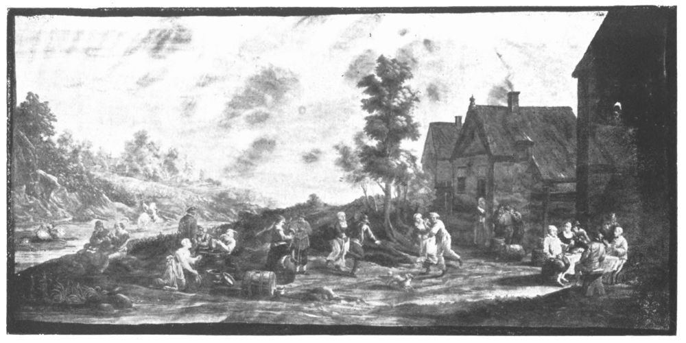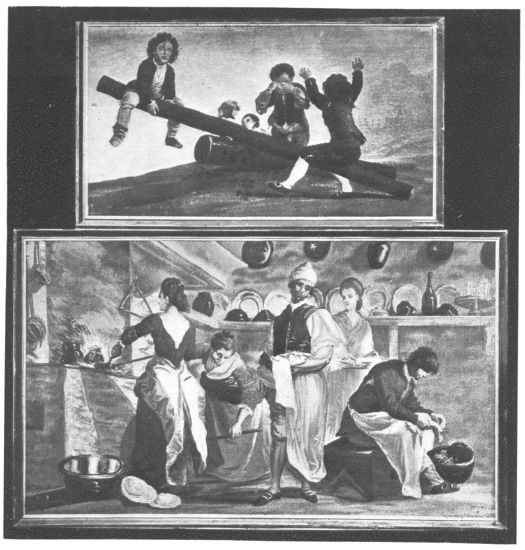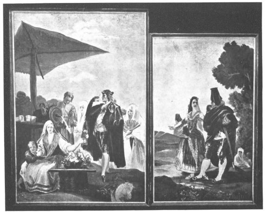 The culmination of the prosperity of the Spanish tapissiers was marked by the execution of the celebrated Goya tapestries. These cartoons, to the number of forty-five, were designed for the decoration of the apartments of the Prince of Asturias in the Prado. Some of them, however, are to be found on the walls of the Escorial, and many, unhappily, have been lost. Goya brought to his task his own peculiar talents. Hitherto the designers of cartoons had been content to find their inspiration in ancient Bible stories or in the myths of Greece or Rome. They had depicted incidents from the life of Christ and the{12} Virgin Mary; they had painted moralities, virtues, and vices. Goya did none of these things. When he was summoned from Rome to Madrid by Raphael Mengs, then the director of the workrooms of the Spanish capital, he decided to portray in tapestry the actual life of the people around him. In place of the stilted, conventional figures of his predecessors he produced cartoons instinct with life and vivid movement. The enthralling realism of the bull-fight, village fairs and festivals, the romantic loves of Andalusian peasants, the popular excitement of kite-flying—these were the subjects treated by this most realistic of artists.