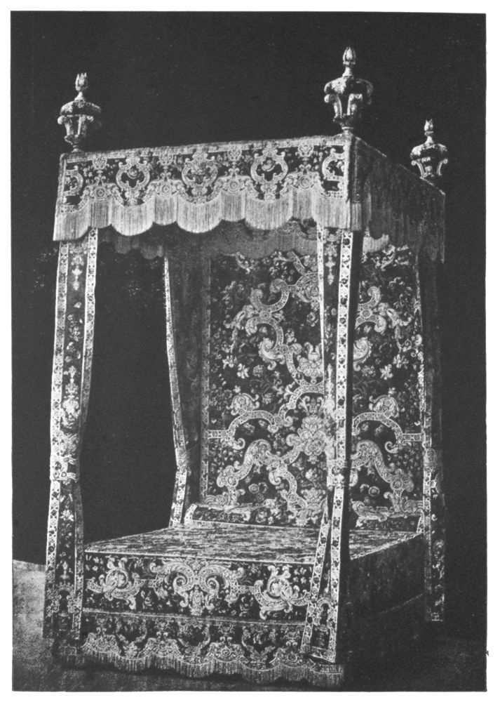 On the completion of the new palace of Madrid in 1764, Charles III. ordered his bedroom to be decorated with tapestries to the number of seventy-seven pieces. These, of which the two plates reproduced here are a fair example, were specially woven at the royal factory at Madrid. They are all of rich materials and fine workmanship, and were used, as well for hangings as for the covering of chairs and couches. The tapestries were designed by Antoine Anglois. The two here reproduced are woven in silk and gold. They were used as a curtain to the balcony of the King’s bedroom and as a counterpane and bolster-cover for the royal bed.