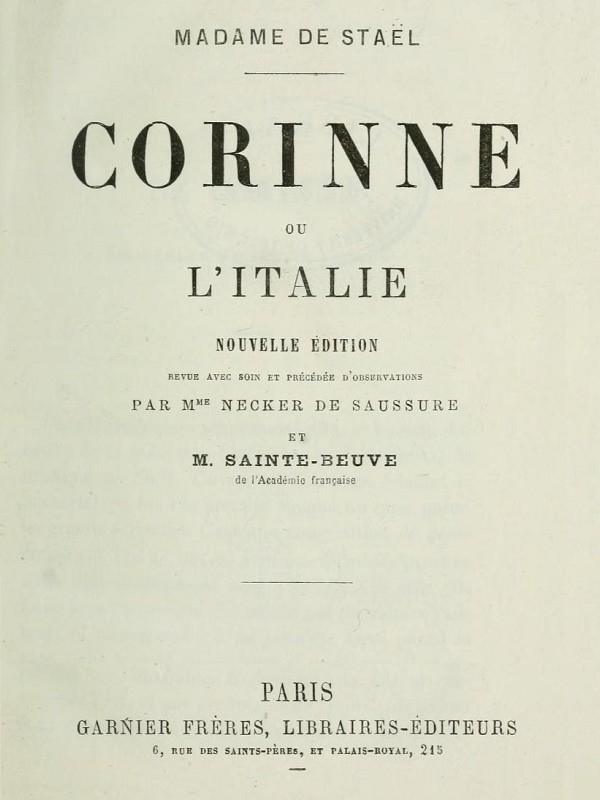 Corinne eut un succès prodigieux. Un ouvrage où les artistes puisaient un nouvel enthousiasme avec de nouveaux moyens de l'exprimer, les érudits des rapprochements ingénieux, les voyageurs des directions heureuses, les critiques des observations pleines de finesse, où les âmes les plus froides s'ouvraient à l'émotion, enfin où il y avait du plaisir jusque pour la malice même dans ces portraits de nations si plaisamment caractéristiques, un tel ouvrage, dis-je, enleva de vive force tous les suffrages, entraîna toutes les opinions. Il n'y eut qu'une voix, qu'un cri d'admiration dans l'Europe lettrée; et ce phénomène fut partout un événement.