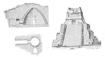 Meanwhile, an intermediary stage between the highly developed pyramids and the primitive dolmen is represented in the Altun-Obu Sepulchre, near Kertsch in the Crimea. Here the mound is faced with layers of shaped stones, with which also the chamber and the passage leading to it are lined. The ceilings of both are constructed of courses of stone, each of which projects a little beyond the one beneath it, until the diminishing space is capped by a single stone. In the angle of masonry thus formed is discoverable the rudimentary beginning of the arch.