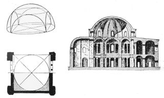 Meanwhile, this rude method of spanning an opening with more than one piece of stone was the primitive germ of the later development of arch, vault, and dome construction, just as the placing of a single horizontal stone on two upright ones is the prototype of columns and entablature. Thus the instinct of man, in earliest times,{16} reached out toward the two fundamental principles of architectural construction.