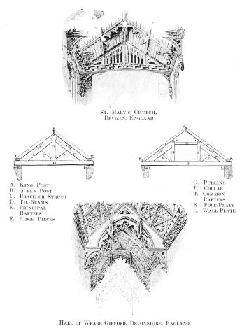 In these crude devices to mark the burial places of{8} dead heroes and to provide for the necessities of religion, primitive man used the stones as he found them, with a preference for those of enormous size, to ensure permanency. Meanwhile, in the huts that he erected for the living, it is reasonable to suppose that, when available, the more perishable material of timber was employed. And here, again, he would use at first the smaller limbs, planting them in the ground in a circle or square and drawing them together at the top, so that they took the shape of a heap of stones; and covering them with skins, so that they became the prototype of the tent. Then gradually he would employ stouter timbers, planting them upright and keeping them in place at the top with horizontal timbers. On these would be laid transverse beams to form a roof; the spaces between the beams, as between the uprights of the walls, being filled in with wattles of twigs or reeds and rendered still more impervious to weather by a coating of clay or mud.