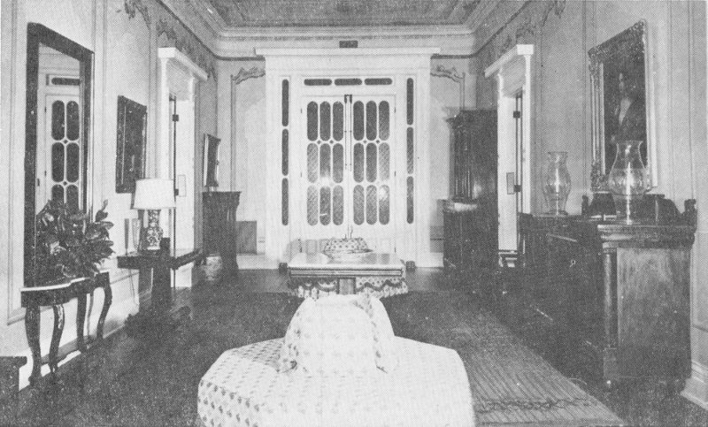 The spacious reception hall that extends the length of the main part of Beauvoir House immediately claims attention by its now seldom seen rounded corners, unusually high ceiling, and beautifully frescoed walls and ceiling done by the German artist Meuhler, later retouched by a talented decorator. But there is great interest also in the furnishings, almost all of which were used by Jefferson Davis and his family during their occupancy of Beauvoir, and either kept there or returned later.