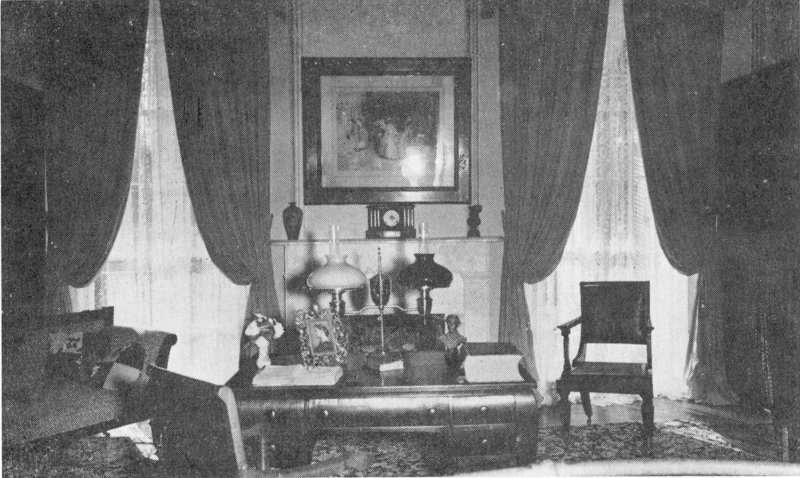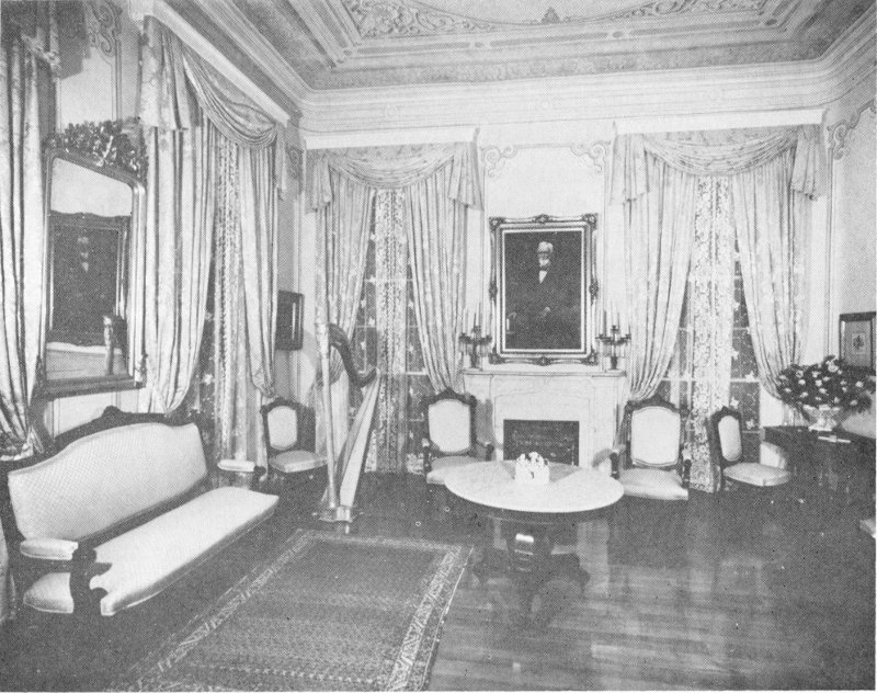 The Front Parlor used by the Davis family as their parlor has, as has the back parlor or library, the same rounded corners, high ceiling, and frescoed walls and ceiling found in the reception hall. It is furnished almost entirely with original pieces; but the fine portrait of Jefferson Davis made after his 81st birthday is not one of these. It was painted by G. B. Matthews and presented to the Shrine by Mrs. Darling of New York. At the left of the door is a portrait of Mr. Davis’ mother.