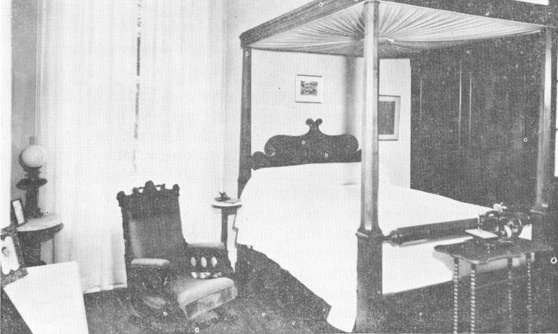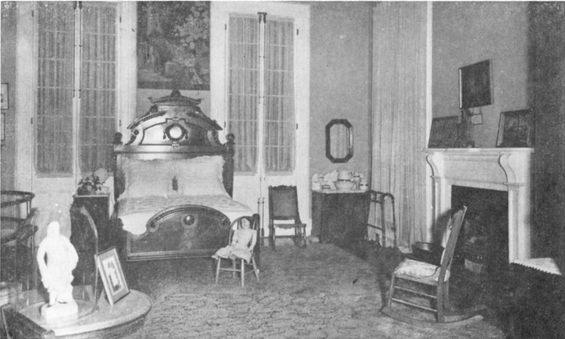 The rooms occupied by Jefferson Davis and Mrs. Davis, with a connecting door between, form an offset on the west side of the house to the left of the back parlor or family study. Jefferson Davis’ room faces the Gulf and has the advantage of being entered from the front or back without passing through any other room. The furnishings in this room, that were there when Jefferson Davis was an occupant of it, are the large rocking chair, the bed, the washstand and washstand set, towel rack, cigar stand, and the leather foot locker or small trunk used by him during the Mexican War and for trips abroad, when ex-President of the Confederate States of America. Hanging over the bed is a framed garland of flowers made from pieces of cloth, similar in color to the flowers copied to make this attractive but unusual piece. On the back of it is this explanation, written by Mrs. Davis—“Hearing Jefferson Davis was dying and lacked comforts in Fortress Monroe, the Southern women made this piece of work as a cushion cover and sent it to him among other things. 350 women took a few stitches on this gift sent in 1866”. The painting over the mantel is Mrs. Davis as she was in 1898. The photograph below on the left is Mrs. Davis as a young girl. On the right is one of Winnie as a child, and below it, one of Jefferson Davis, Jr., in costume.