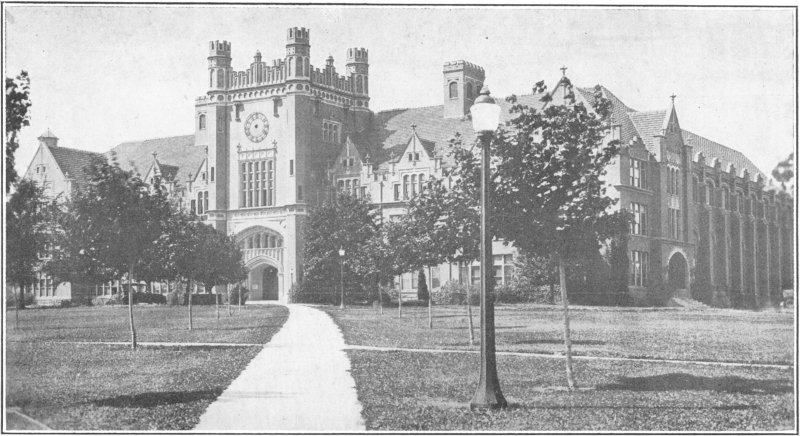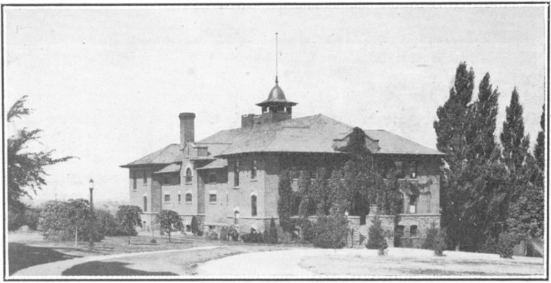 As they strolled up the pathway to the Administration Building in the sunshine of that February morning, the beauty of the campus and its surroundings was revealed to them as they had not even imagined it the night before. The rich Gothic lines of the Administration Building stood out sharply against the rolling hills of the Palouse country, still glistening with snow. To the south appeared the Engineering Building and Ridenbaugh Hall, pleasing in architecture 8 and harmonizing with the main building in the soft red of their walls and the weathered green of the roofs. Slightly to the rear was the Gymnasium, looking peaceful enough now, after the hard battle of the previous night.