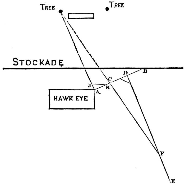 It was not to be supposed that a Texan sentry, seeing us measuring with a cord on the inside of the stockade, would ever dream that we were measuring distances on the outside. Yet it was desirable that our measurements should be few and quickly done. After thus marking the line, and also measuring upon it twenty feet, Captain Torrey, of the 20th Iowa and myself, carried it up to the Hawk-eye cabin, dropped it on the ground, and quickly drew it into the form of the little triangle—A J K. As soon as the side A J came on a line with the tree, one of us glanced along the other side A K and noted the point B where its projection struck the stockade. He then quickly measured twenty feet in this direction, and stuck a peg in the ground at C. He measured twenty feet more and placed another peg at D. Here we re-set the triangle, which gave us the new direction D E. One of us then walked down this course till he found himself on a line with the peg C and the tree. 187Here we placed another peg, F. We then picked up the cord and came away. When the guard was relieved, and a new set of sentries stood around the stockade, we went back and measured the distance from F to D. It was equal to the distance from the cabin to the tree.