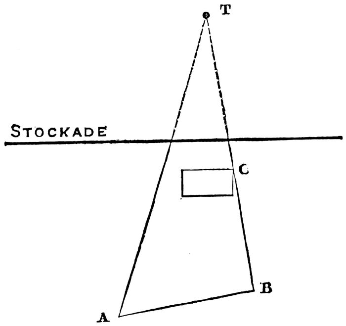 To ascertain the exact distance of the tree was a harder task. For this three methods were suggested. It was first proposed that an officer should go out for wood, and as he passed this part of the stockade, some one should request him to copy the inscription on a head-board. He would then come up to the stockade for a pencil, and 185thence walk directly to the tree, counting his steps as he went. The objection to this was that it might excite suspicion, and draw attention to the tree.