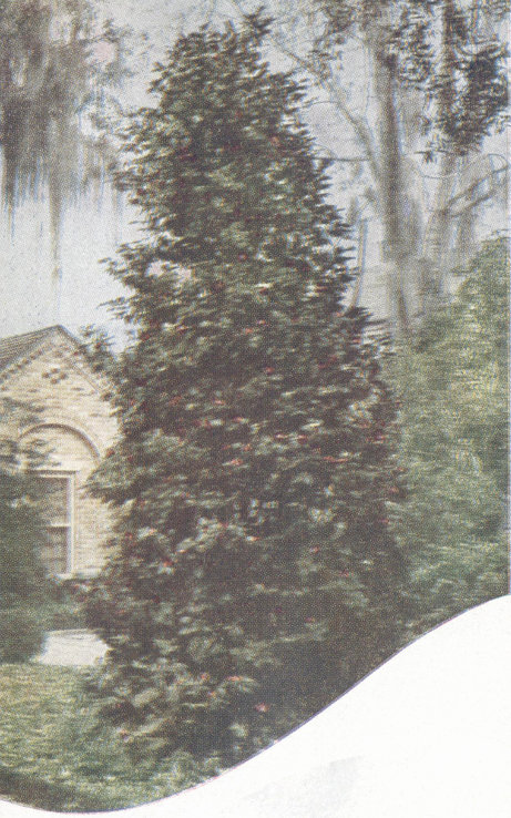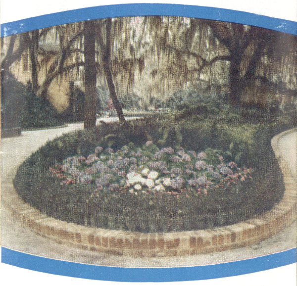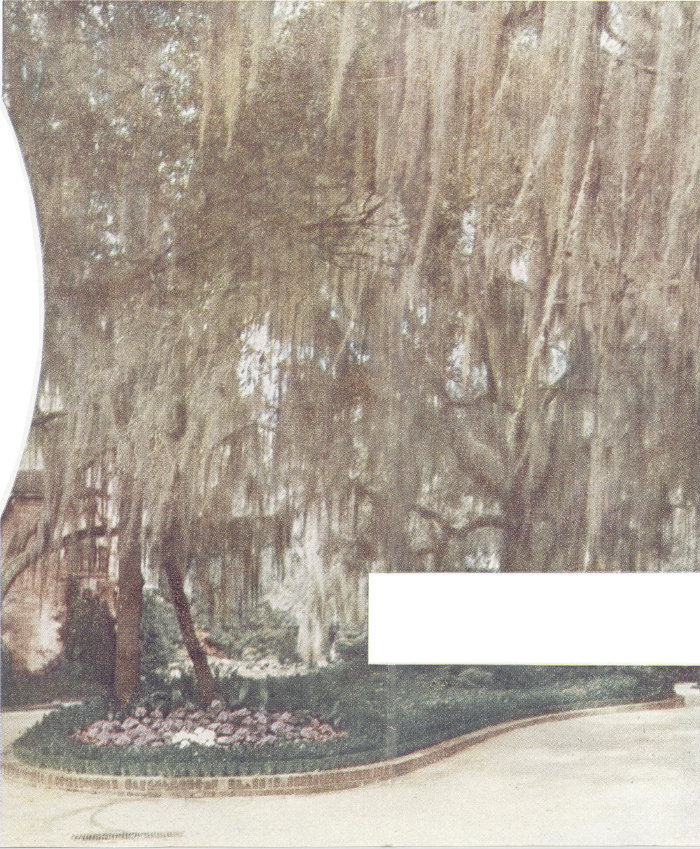 A fountain, canopied by waving gray moss, presents one of the loveliest scenes in this “Charm Spot of the Deep South.” It seems to whisper, “Here We Rest.”