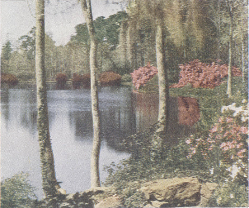 Though each season envelops the world in its own peculiar beauty and charm, not the wildest dreams of the most fervid and keen imagination can conjure the beauty of Bellingrath Gardens when Azaleas are blooming. Thousands of them line the many rambling walks that wind over this marvelous estate. Around the lily-bordered lake—Mirror Lake—you go enthralled by the gigantic Azaleas that scatter their trillion petals from the million flowers that cover a single bush. Mobile’s own romantic history is closely interwoven with this gorgeous flower, and dates as far back as the founding of the city in 1711. From carefully authenticated sources it was learned that a young Frenchman living in Mobile visited France to see his grandparents. So impressed was he by the dazzling Azaleas that on his return to Mobile he brought back three varieties; the pink, the purplish red, the white. And today in Bellingrath Gardens you find some of the oldest and largest Azalea bushes in America, specimen plants that have been collected at great expense from old gardens all over the South, and transplanted here in a perfect setting.