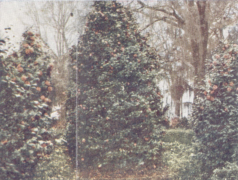 In the middle of Act I the Camellia Japonica is joined by its costar, the Azalea, and together they march on triumphantly to the enthusiastic applause of an appreciative audience. During January and February the Camellia Japonica reaches its heights, graciously yielding the spotlight to the glorious Azalea as the scene changes from winter to spring. There are no fitting words to describe the colorful and appealing drama of the dainty Camellia Japonica meeting the glorious Azalea when both are at their best. It is an act that never fails—a spectacle never to be forgotten.