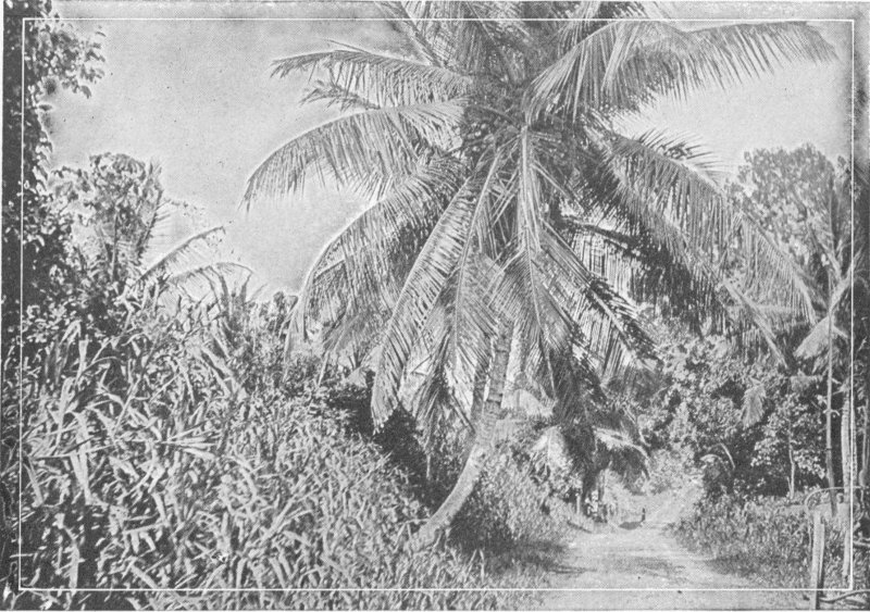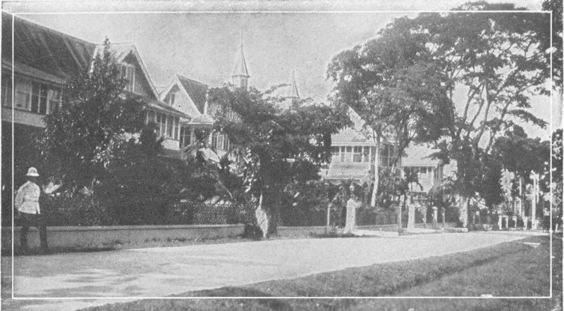 In Trinidad the thermometer records 85 degrees almost every day and never changes more than twenty degrees. The only difference between one season of the year and another, is that for a few months it rains. Even in the rainy season, however, and nearly every day, there is an abundance of bright sunshine. There are fine shops, large warehouses filled with chocolate beans, sugar and other 5 tropical products; and one can ride on trolley cars made in Philadelphia. The most popular hotel faces the great Savannah, a wide stretch of lawn bordered by trees. There are beautiful drives to the Reservoir; up the mountains to Maracas Waterfall with vista of the Caribbean a thousand feet below; through avenues of giant bamboos arching over the roadway, and through miles of plantations of cacao.