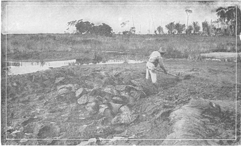 The gangs of barefooted workmen in a place number thirty, of whom half a dozen do the digging on a space perhaps sixty feet long 12 and forty wide, and in the course of a day dig to a depth of about three feet. That same spot the next morning may look a little rough but will be approximately level with the level of the lake. The hole fills up, and in the course of a week all traces of the digging are obliterated, which does not mean necessarily that fresh asphalt has come into the lake from below. On the contrary, the excavations are filled by a slow settling or leveling of the surface asphalt. Near the middle of the area the material is softer, and in a few places it may be seen in small irregular patches oozing up from below, and of the consistency of putty.