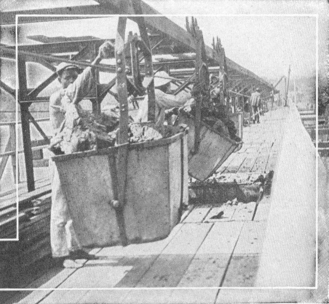 The loaded cars are halted under a conveyor cable. Very rapidly the hooks which swing from the cable are thrown into place, and the big bucket is lifted from the truck and goes off down the hill. The carriers are clamped to the moving cable, all the buckets moving along at the same rate of speed. The weight of those going down helps to pull the empties back again, so that not very much power is needed to keep the cable moving.