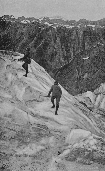 For many years after this the glaciers were not traversed to any extent save by camping-out parties, who contented themselves with short excursions about the terminal faces, until, in 1882, a fresh interest was awakened in their existence by the visit of the Rev. W. S. Green with Herr Emil Boss, of Grindelwald, and Ulrich Kaufmann as guide. His advent was indeed an awakening, and the apathy of the Colonials regarding the scenic marvels of their own country was somewhat aroused. The sensation caused by his memorable ascent of Aorangi, after repeated struggles with flooded rivers and all those hindrances which seem to fall inevitably to the lot of men who first open out a new district, has become quite an event of history in the annals of the colony.