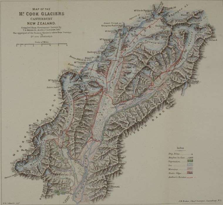 In 1889 the Government surveys were extended to the Mueller and Hooker Glaciers, under Mr. Brodrick, a gentleman whose capability and never-failing pluck in carrying out his work in such rough country is only equalled by his modesty concerning his Alpine achievements, which are necessarily incidental to his profession in the district.