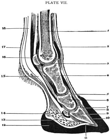 3. | Dorsal vertebræ or back bones. | 17. | Proximal Phalanx, os suffraginis, or large pastern bone. |